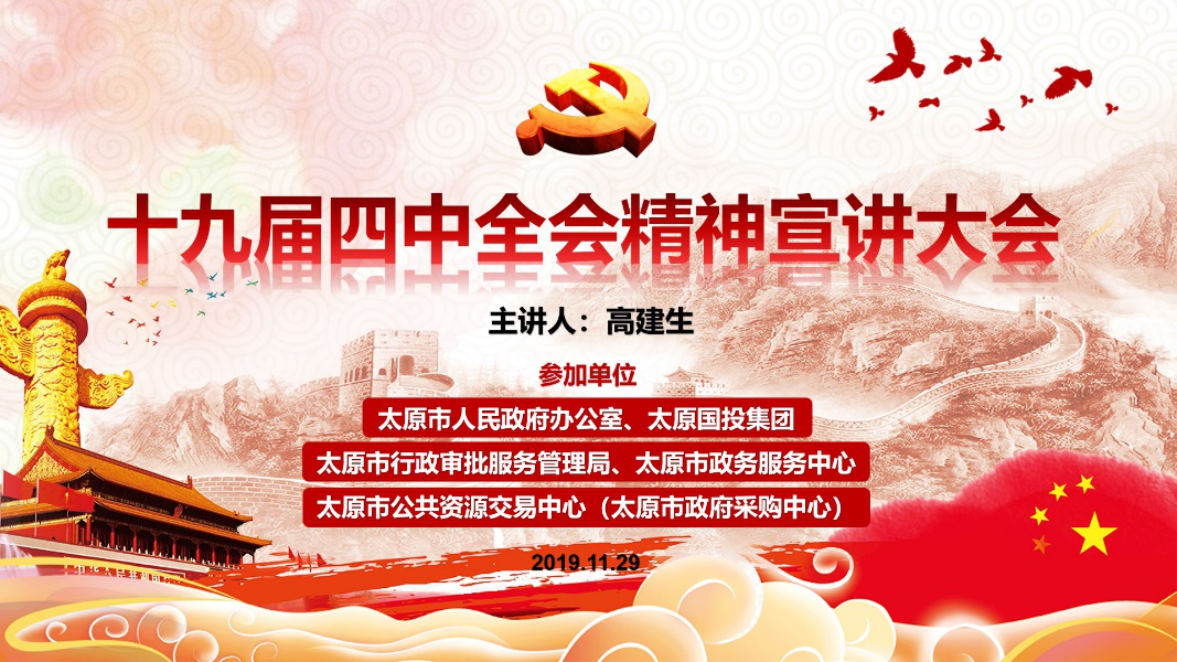 11月29日下午,為深入學(xué)習(xí)貫徹黨的十九屆四中全會精神,公司特邀山西省社會科學(xué)聯(lián)合會副主席,省政協(xié)文史與學(xué)習(xí)委員會副主任,教授,博士生導(dǎo)師、享受國務(wù)院特殊津貼專家、省委聯(lián)系的高級專家,省委黨校原副校長、巡視員高建生教授在太原市為民服務(wù)中心六樓會議室為來自太原市人民政府辦公室、太原國投集團、太原市行政審批服務(wù)管理局、太原市政務(wù)服務(wù)中心、太原市公共資源交易中心(太原市政府采購中心)的200余人,對黨的十九屆四中全會精神進行了宣講。