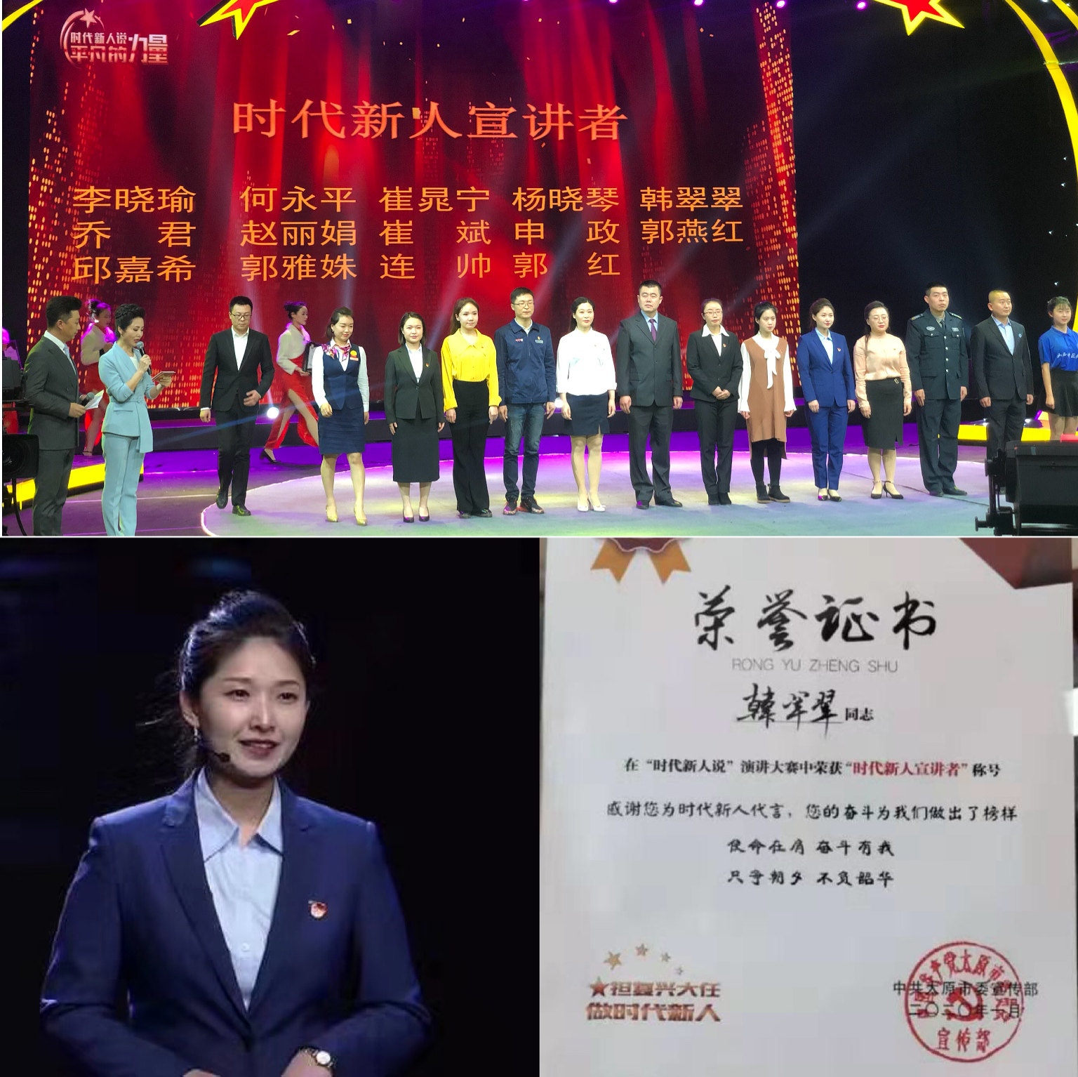 2020年1月15日下午,由中共太原市委宣傳部主辦、太原市廣播電視臺(tái)承辦、人民網(wǎng)山西頻道協(xié)辦的第三季大型講述活動(dòng)“時(shí)代新人說(shuō)—平凡的力量”在太原電視臺(tái)進(jìn)行決賽,我公司韓翠翠同志在第三組決賽中以《黨旗下的文化先鋒》為題進(jìn)行了精彩講述,并榮獲“時(shí)代新人宣講者”稱(chēng)號(hào)。