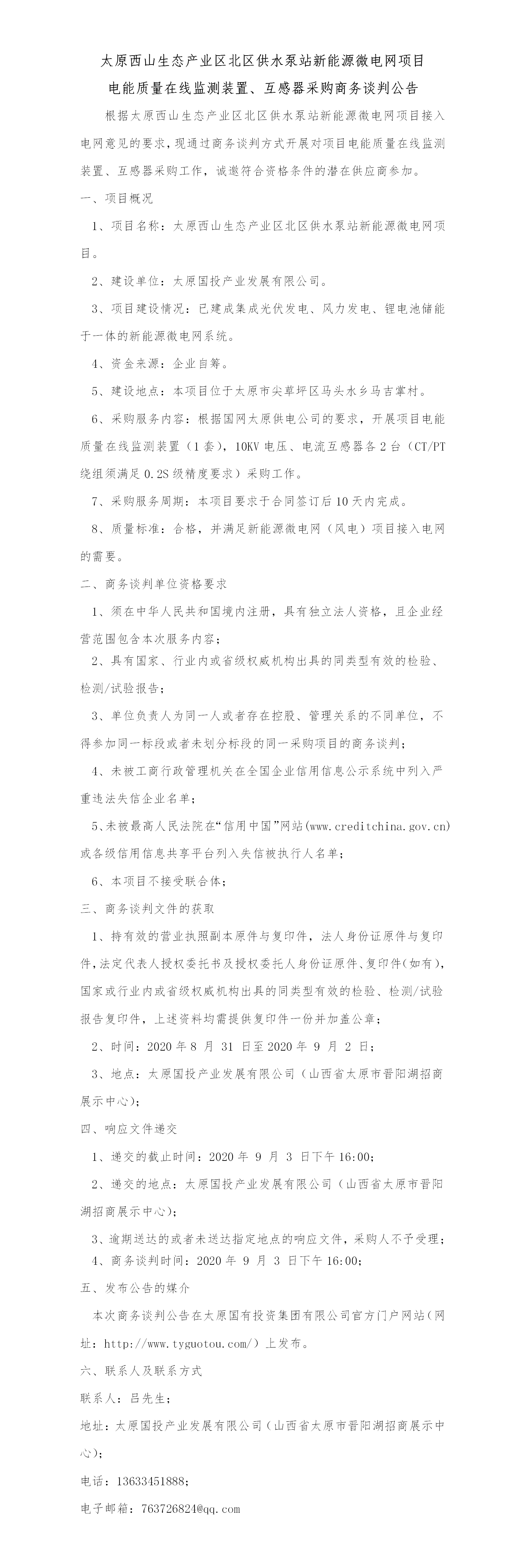 太原西山生態(tài)產(chǎn)業(yè)區(qū)北區(qū)供水泵站新能源微電網(wǎng)項(xiàng)目電能質(zhì)量在線監(jiān)測裝置、互感器采購商務(wù)談判公告