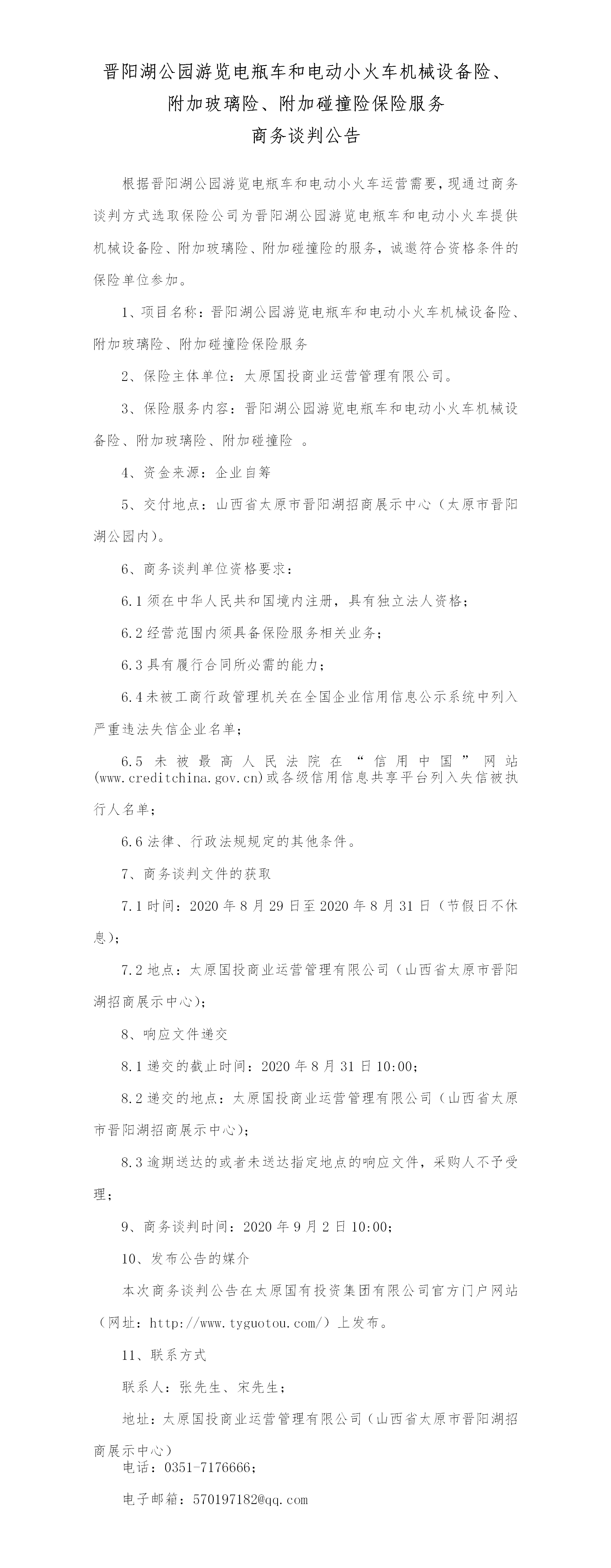 晉陽(yáng)湖公園游覽電瓶車(chē)和電動(dòng)小火車(chē)機(jī)械設(shè)備險(xiǎn)、附加玻璃險(xiǎn)、附加碰撞險(xiǎn)保險(xiǎn)服務(wù)商務(wù)談判公告