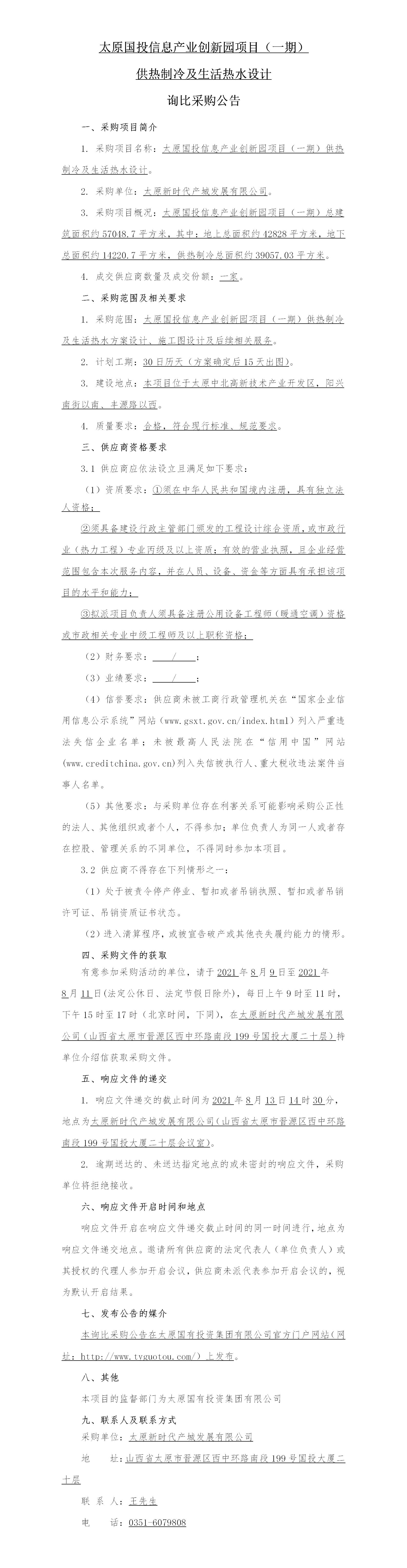 太原國投信息產(chǎn)業(yè)創(chuàng)新園項(xiàng)目(一期)供熱制冷及生活熱水設(shè)計(jì)詢比采購公告