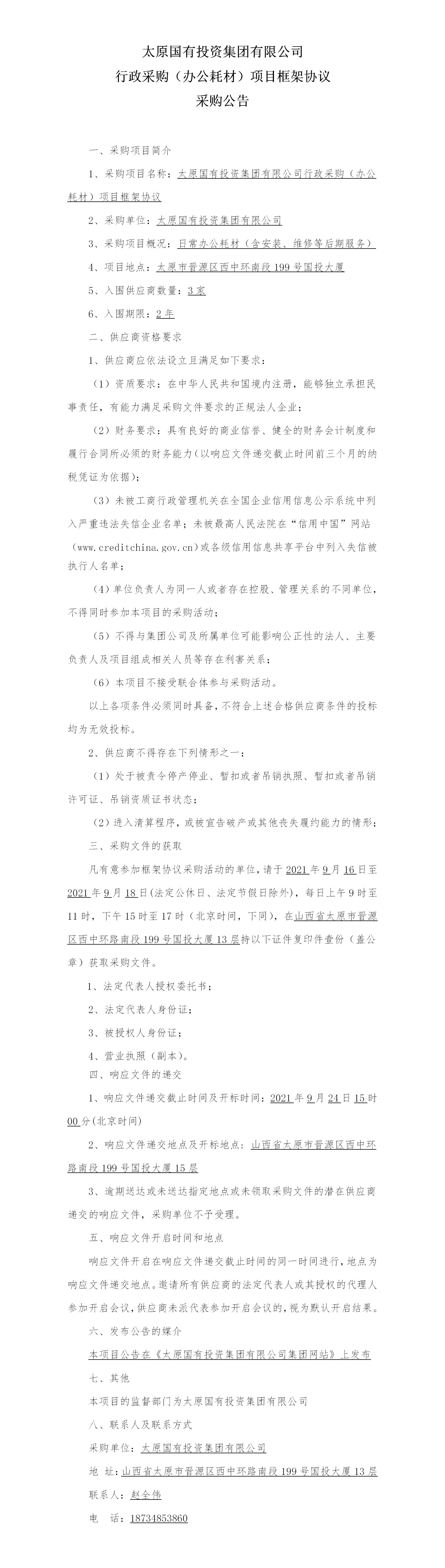 太原國有投資集團(tuán)有限公司行政采購(辦公耗材)項(xiàng)目框架協(xié)議采購公告