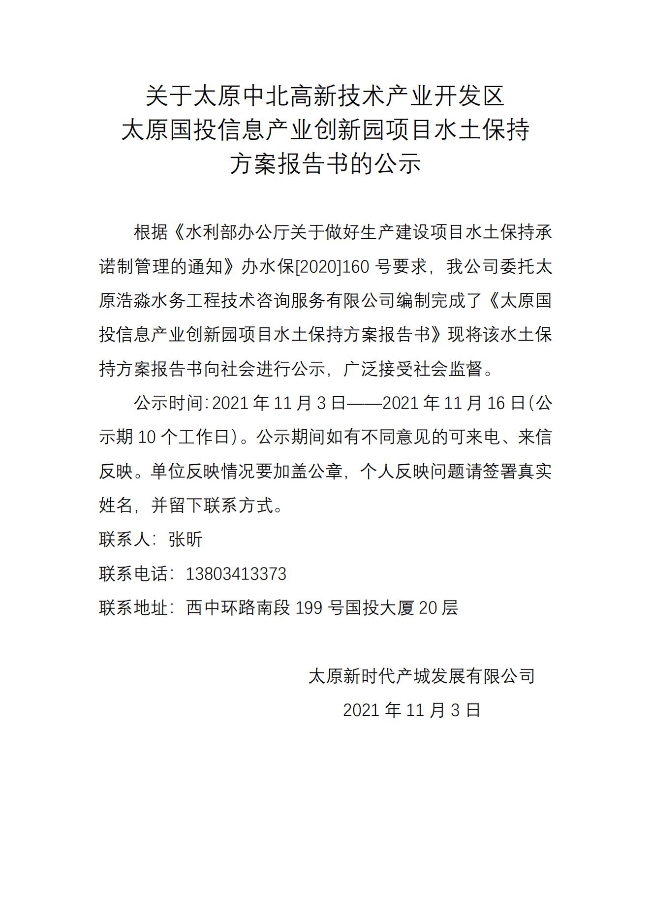關(guān)于太原中北高新技術(shù)產(chǎn)業(yè)開發(fā)區(qū)太原國(guó)投信息產(chǎn)業(yè)產(chǎn)業(yè)創(chuàng)新園項(xiàng)目水土保持方案報(bào)告書的公示