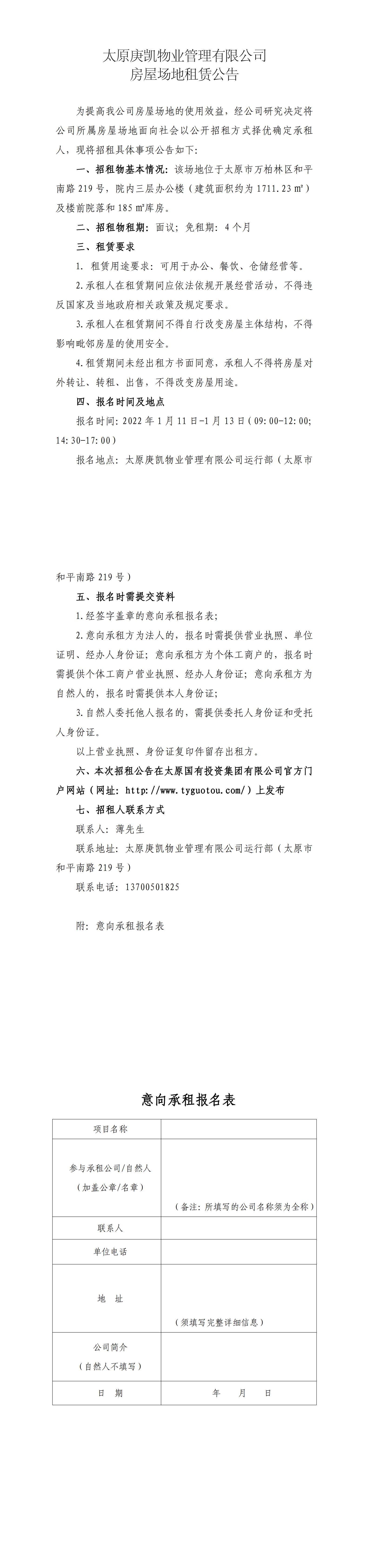 太原庚凱物業(yè)管理有限公司房屋場(chǎng)地租賃公告
