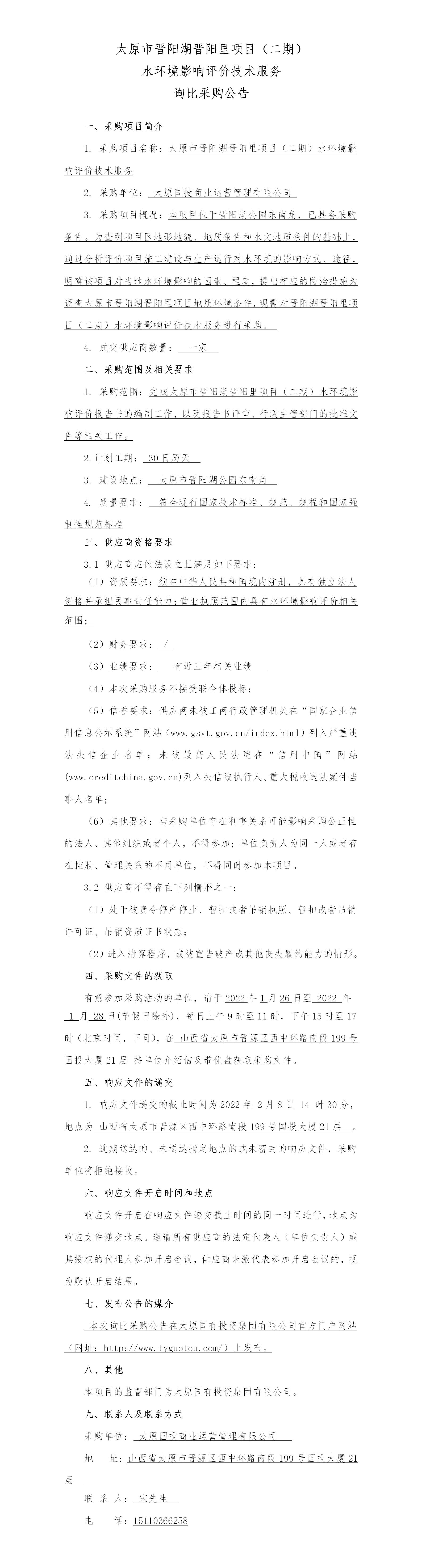 太原市晉陽(yáng)湖晉陽(yáng)里項(xiàng)目(二期)水環(huán)境影響評(píng)價(jià)詢比采購(gòu)公告
