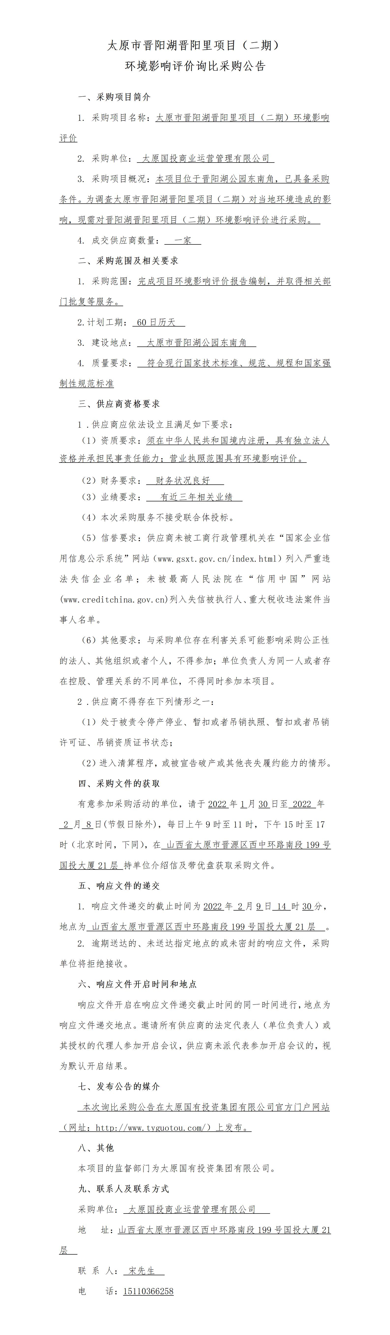 太原市晉陽(yáng)湖晉陽(yáng)里項(xiàng)目(二期)環(huán)境影響評(píng)價(jià)詢比采購(gòu)公告