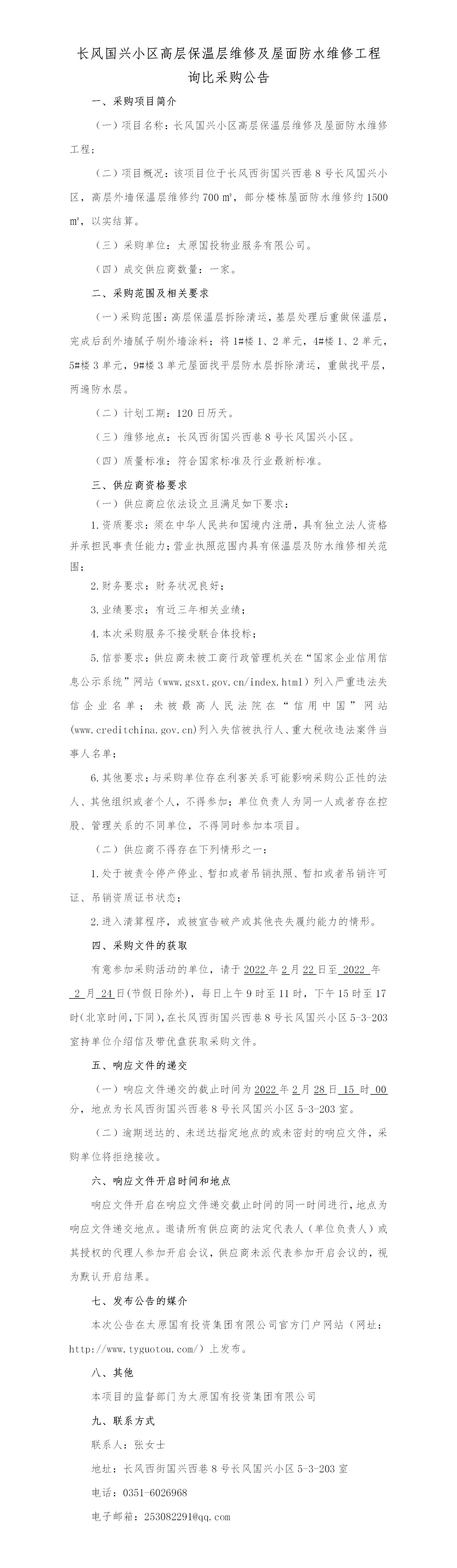 長風(fēng)國興小區(qū)高層保溫層維修及屋面防水維修工程詢比采購公告