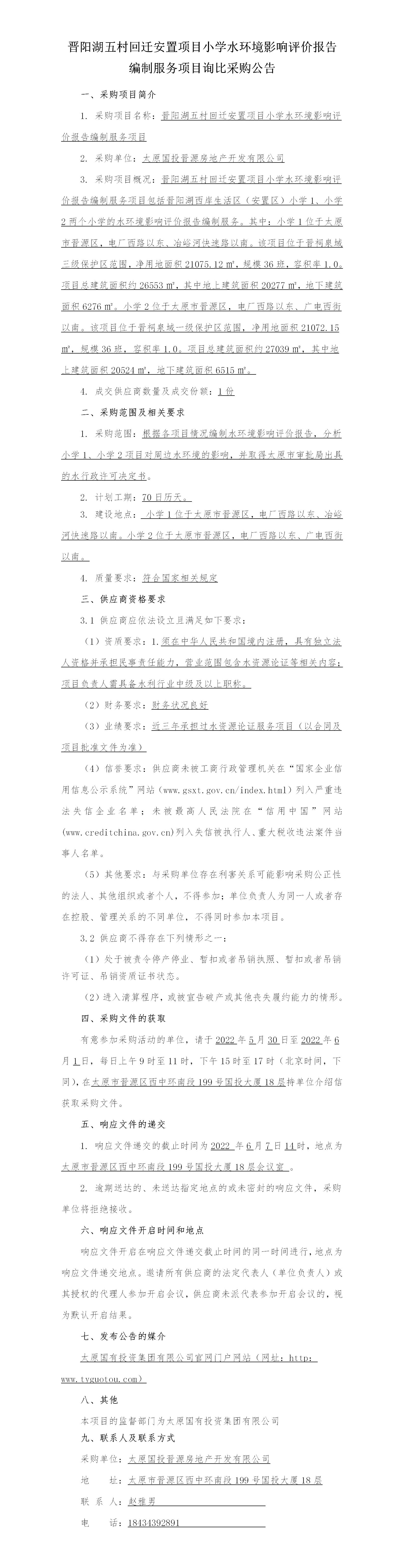 晉陽湖五村回遷安置項目小學(xué)水環(huán)境影響評價報告編制服務(wù)項目詢比采購公告