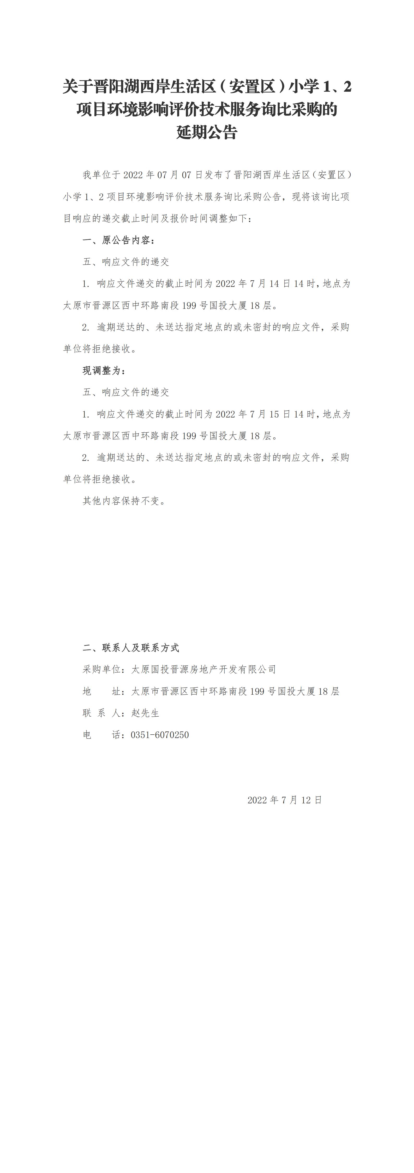 關(guān)于晉陽湖西岸生活區(qū)(安置區(qū))小學(xué)1、2項目環(huán)境影響評價技術(shù)服務(wù)詢比采購的延期公告