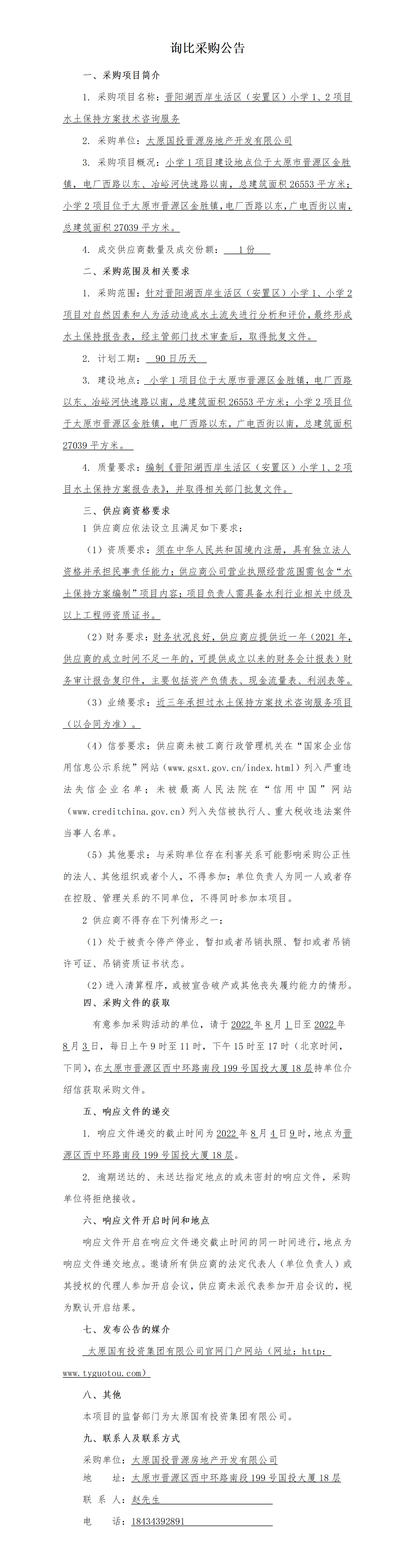 晉陽湖西岸生活區(qū)(安置區(qū))小學(xué)1、2項(xiàng)目水土保持方案技術(shù)咨詢服務(wù)詢比采購公告