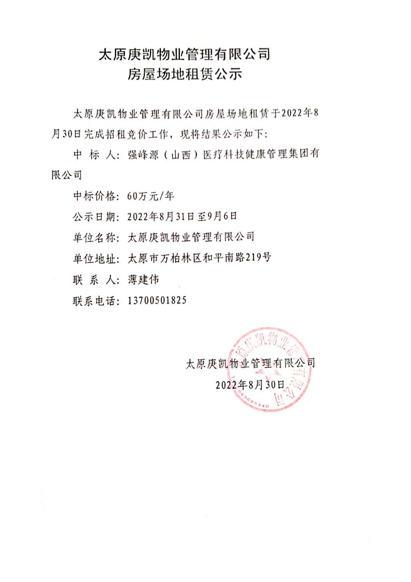 太原庚凱物業(yè)管理有限公司房屋場(chǎng)地租賃公示
