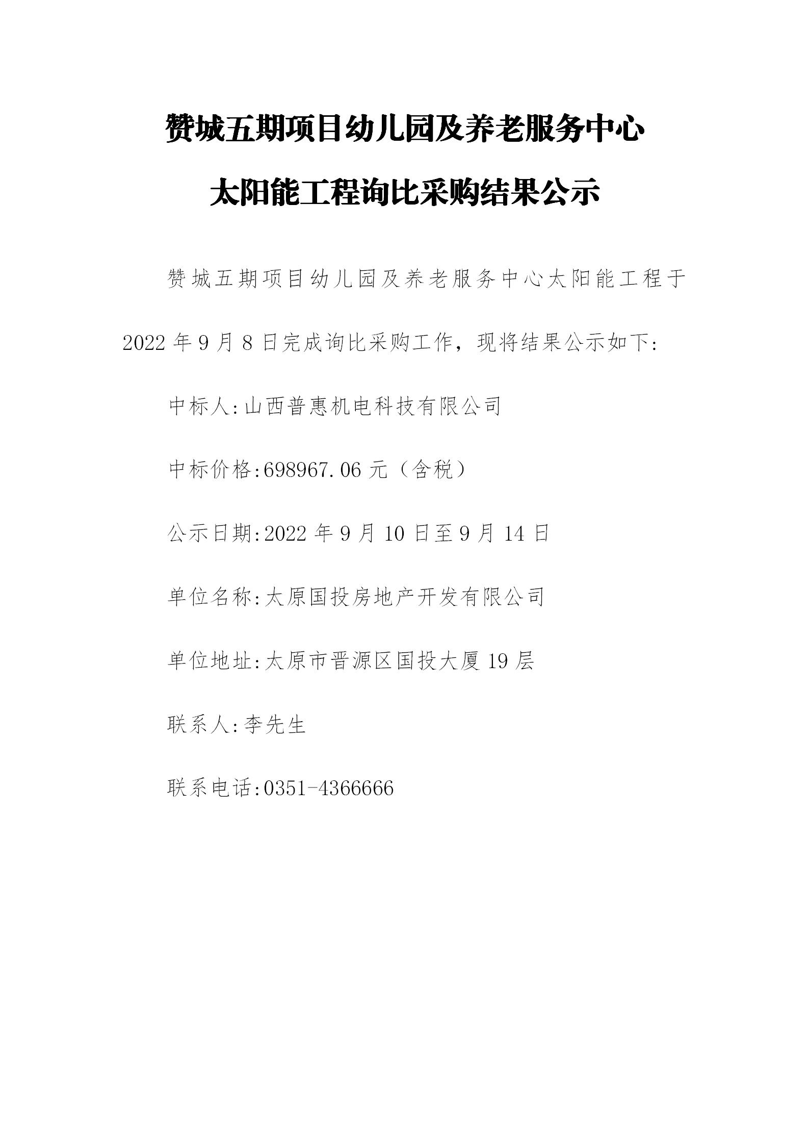 贊城五期項目幼兒園及養(yǎng)老服務(wù)中心太陽能工程詢比采購結(jié)果公示