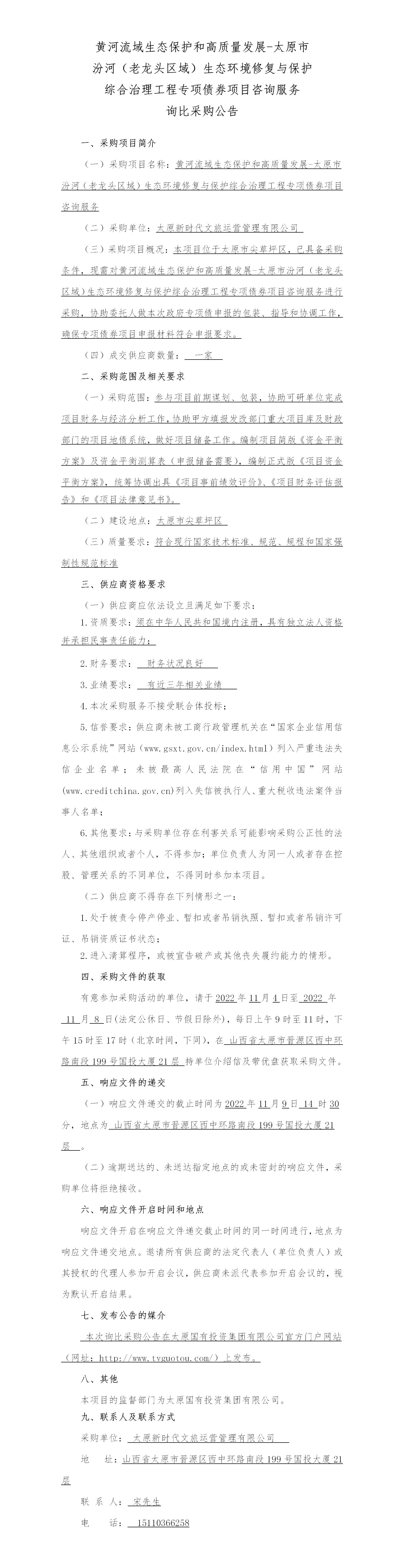 黃河流域生態(tài)保護(hù)和高質(zhì)量發(fā)展-太原市汾河(老龍頭區(qū)域)生態(tài)環(huán)境修復(fù)與保護(hù)綜合治理工程專項債券項目咨詢服務(wù)詢比采購公告