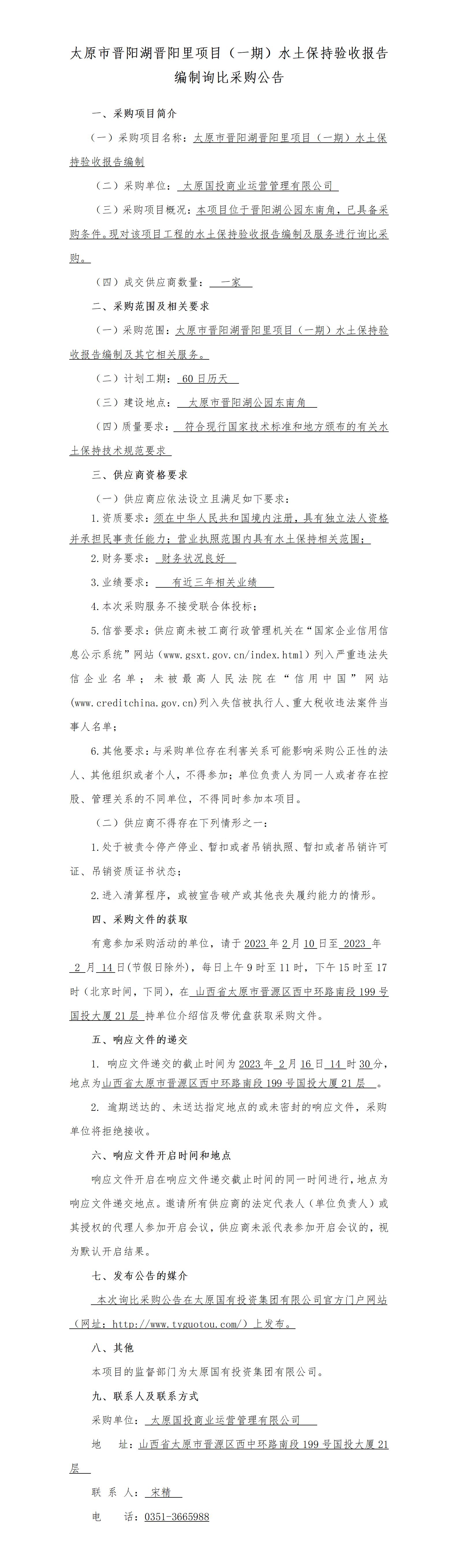 太原市晉陽湖晉陽里項(xiàng)目(一期)水土保持驗(yàn)收?qǐng)?bào)告編制詢比采購(gòu)公告