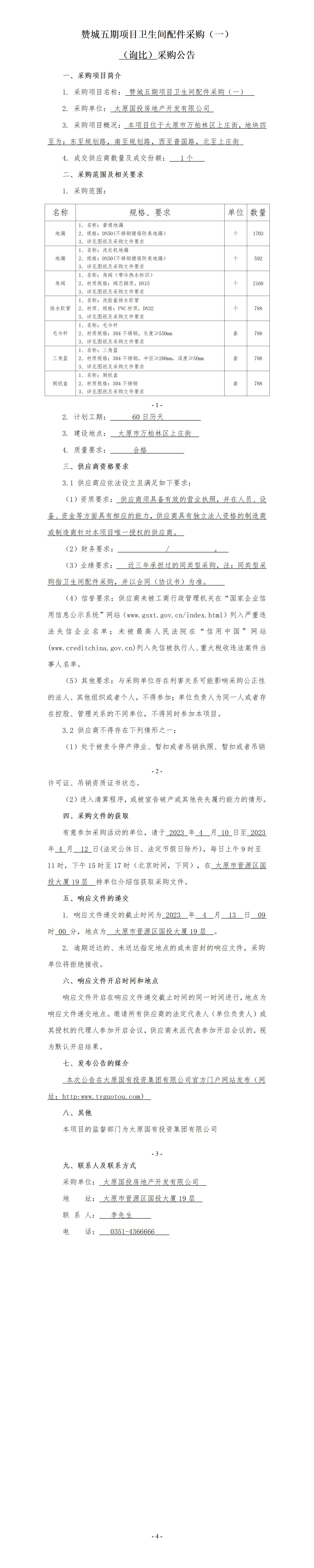 贊城五期項目衛(wèi)生間配件采購(一)詢比采購公告