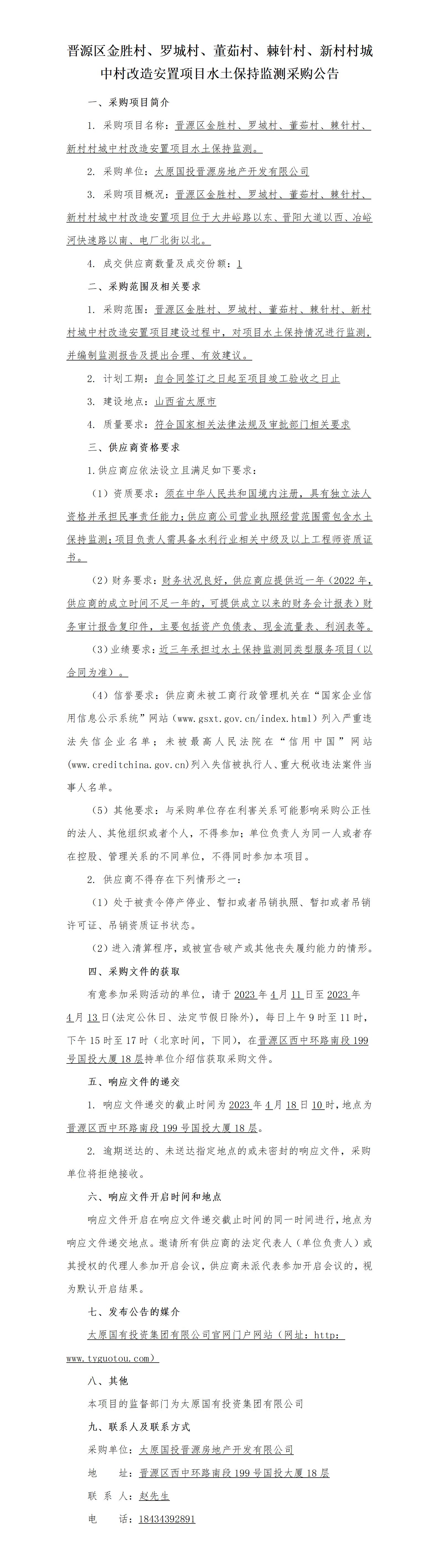 晉源區(qū)金勝村、羅城村、董茹村、棘針村、新村村城中村改造安置項(xiàng)目水土保持監(jiān)測詢比公告