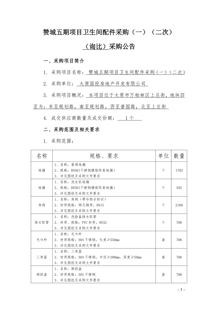 贊城五期項(xiàng)目衛(wèi)生間配件采購(一)(二次)(詢比)采購公告