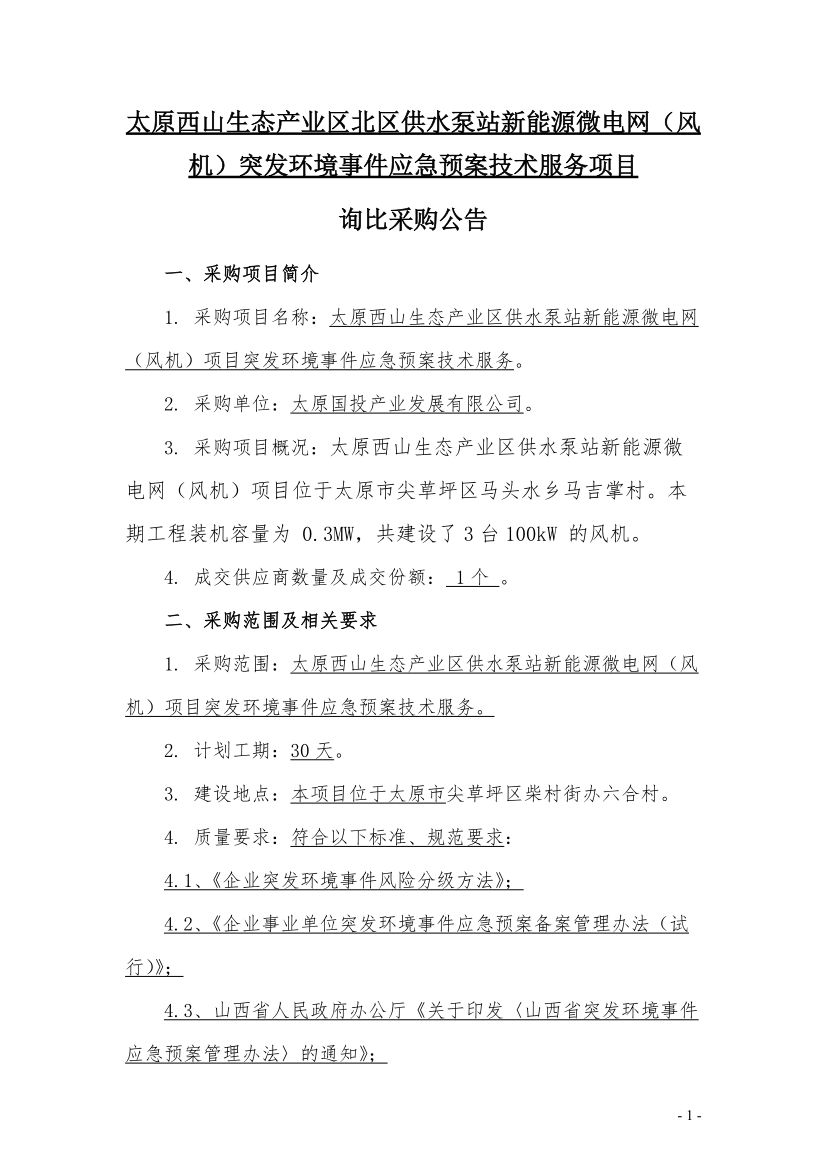 太原西山生態(tài)產(chǎn)業(yè)區(qū)北區(qū)供水泵站新能源微電網(wǎng)風機突發(fā)環(huán)境事件應(yīng)急預(yù)案技術(shù)服務(wù)項目詢比采購公告