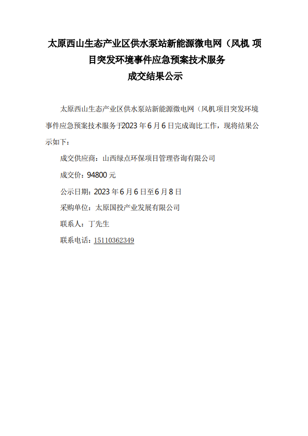 太原西山生態(tài)產(chǎn)業(yè)區(qū)供水泵站新能源微電網(wǎng)風(fēng)機(jī)項(xiàng)目突發(fā)環(huán)境事件應(yīng)急預(yù)案技術(shù)服務(wù)采購(gòu)詢比成交結(jié)果公示
