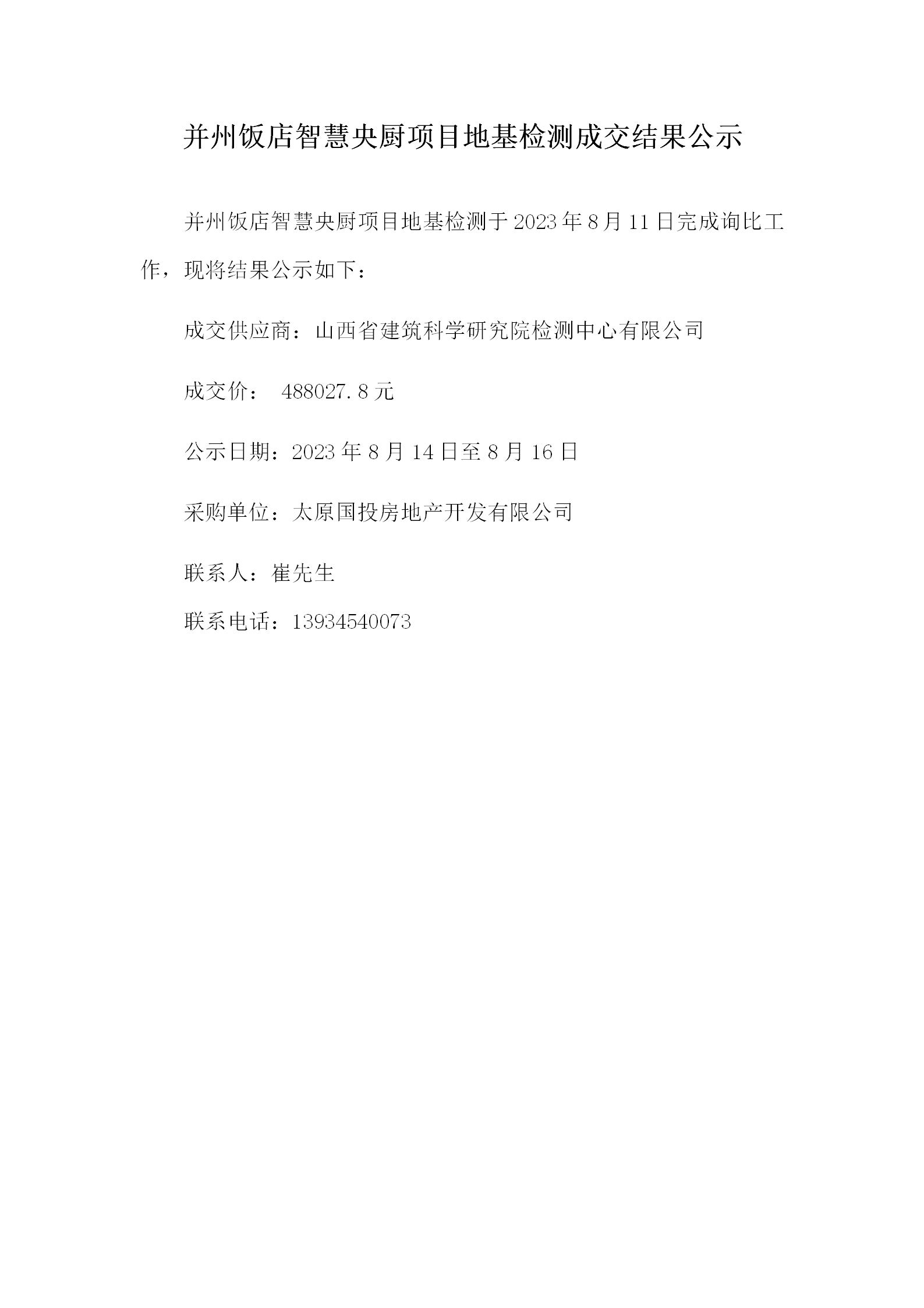 并州飯店智慧央廚項目地基檢測成交結果公示