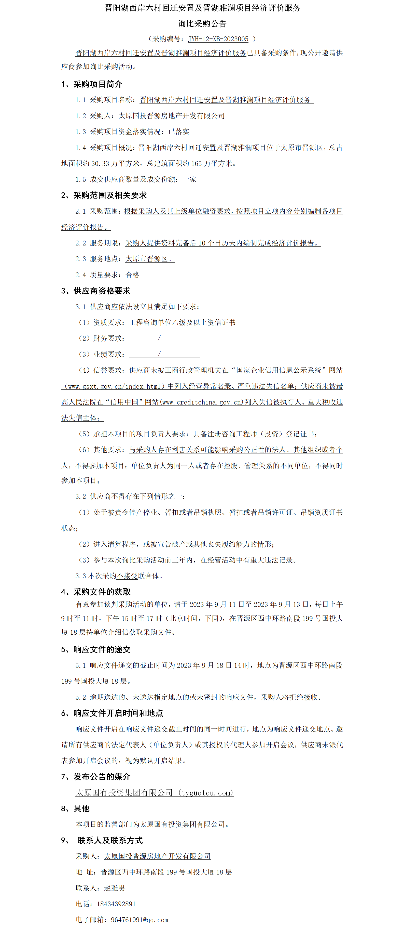 晉陽湖西岸六村回遷安置及晉湖雅瀾項目經(jīng)濟(jì)評價服務(wù)詢比采購公告