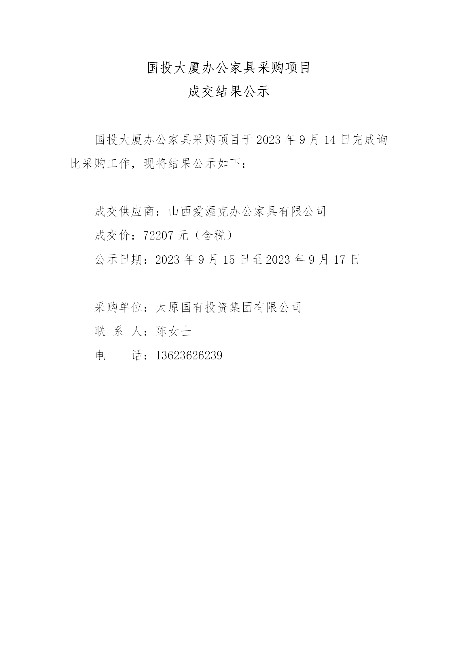 國投大廈辦公家具采購項(xiàng)目成交結(jié)果公示
