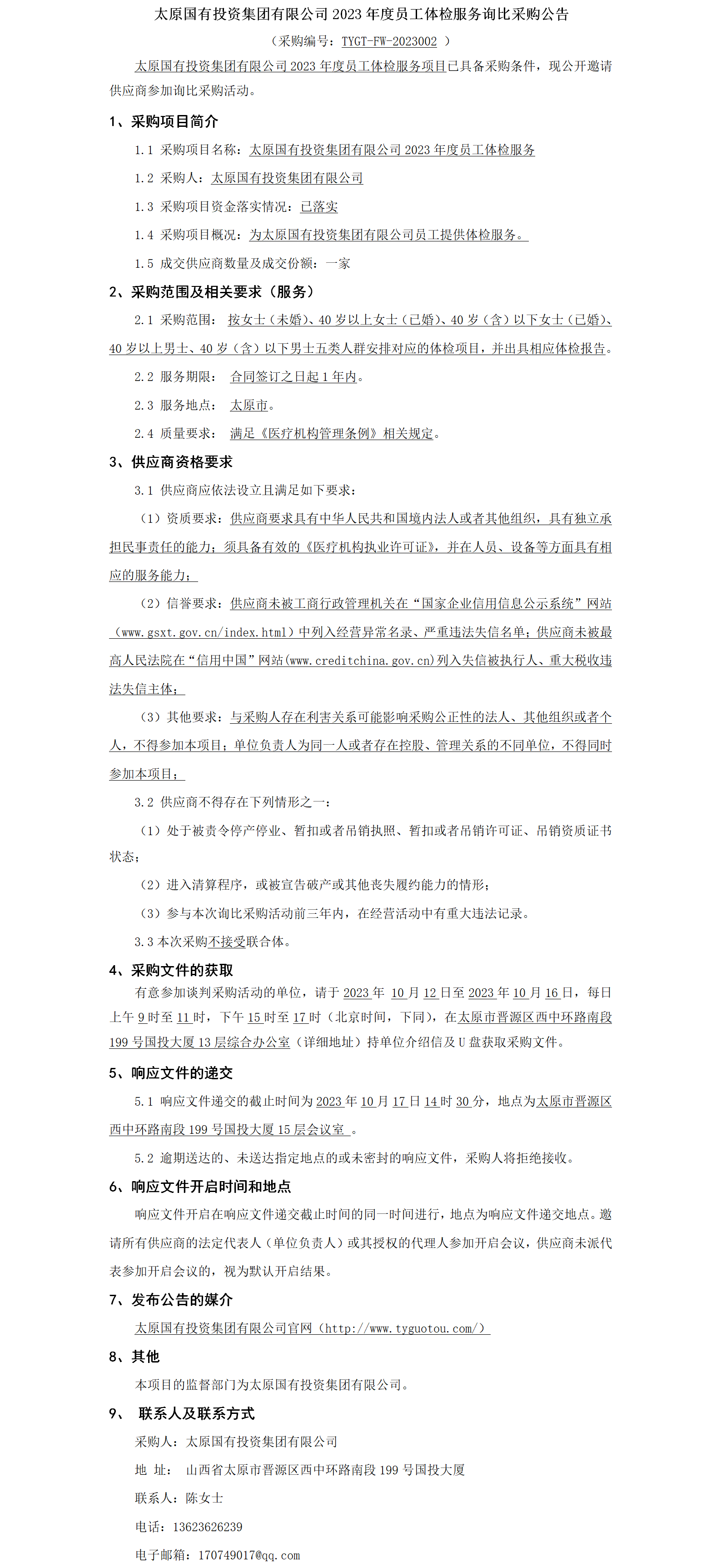 太原國有投資集團(tuán)有限公司2023年度員工體檢服務(wù)項目詢比采購公告