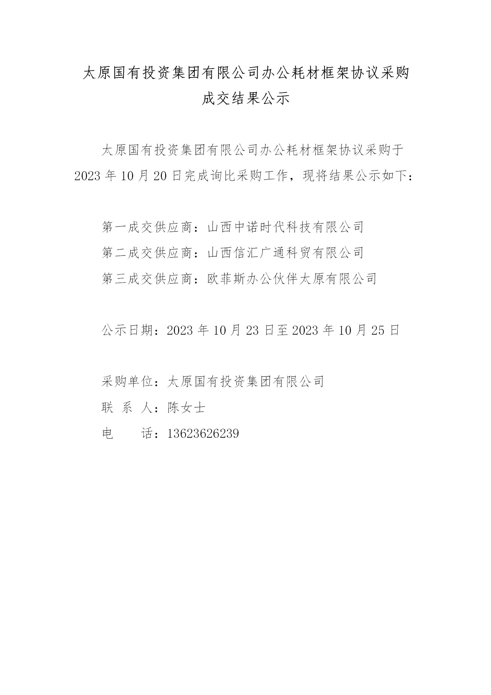 太原國(guó)有投資集團(tuán)有限公司辦公耗材框架協(xié)議采購(gòu)成交結(jié)果公示