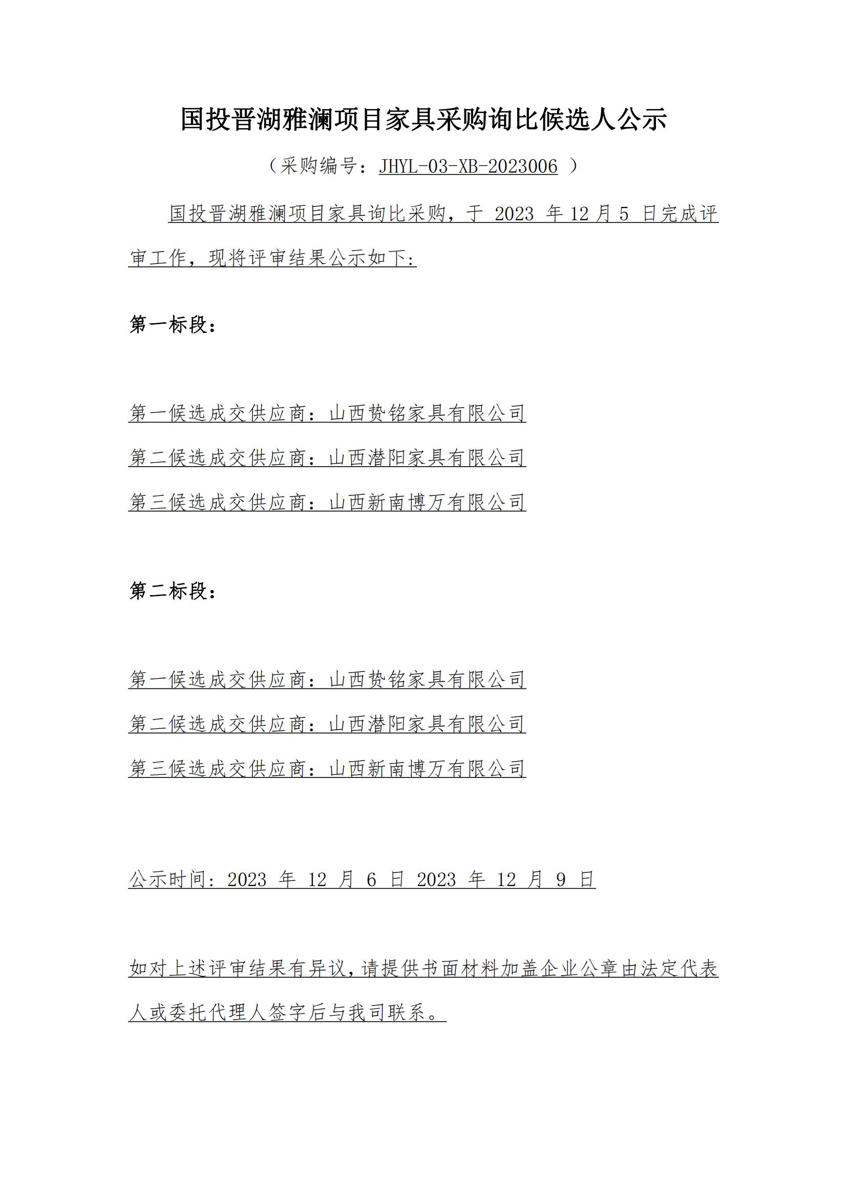 國投晉湖雅瀾項目家具采購詢比候選人公示