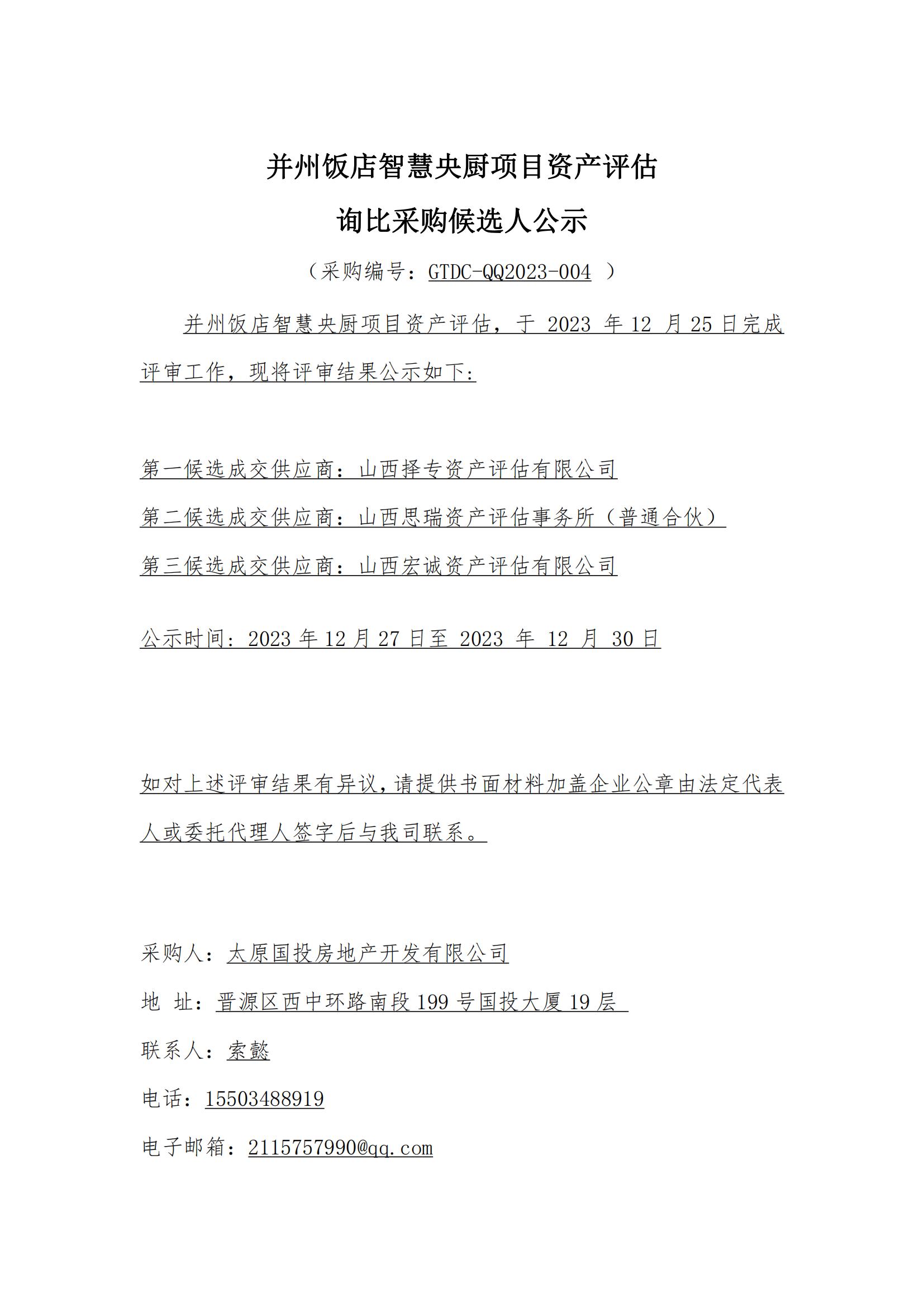 并州飯店智慧央廚項目資產(chǎn)評估詢比采購候選人公示