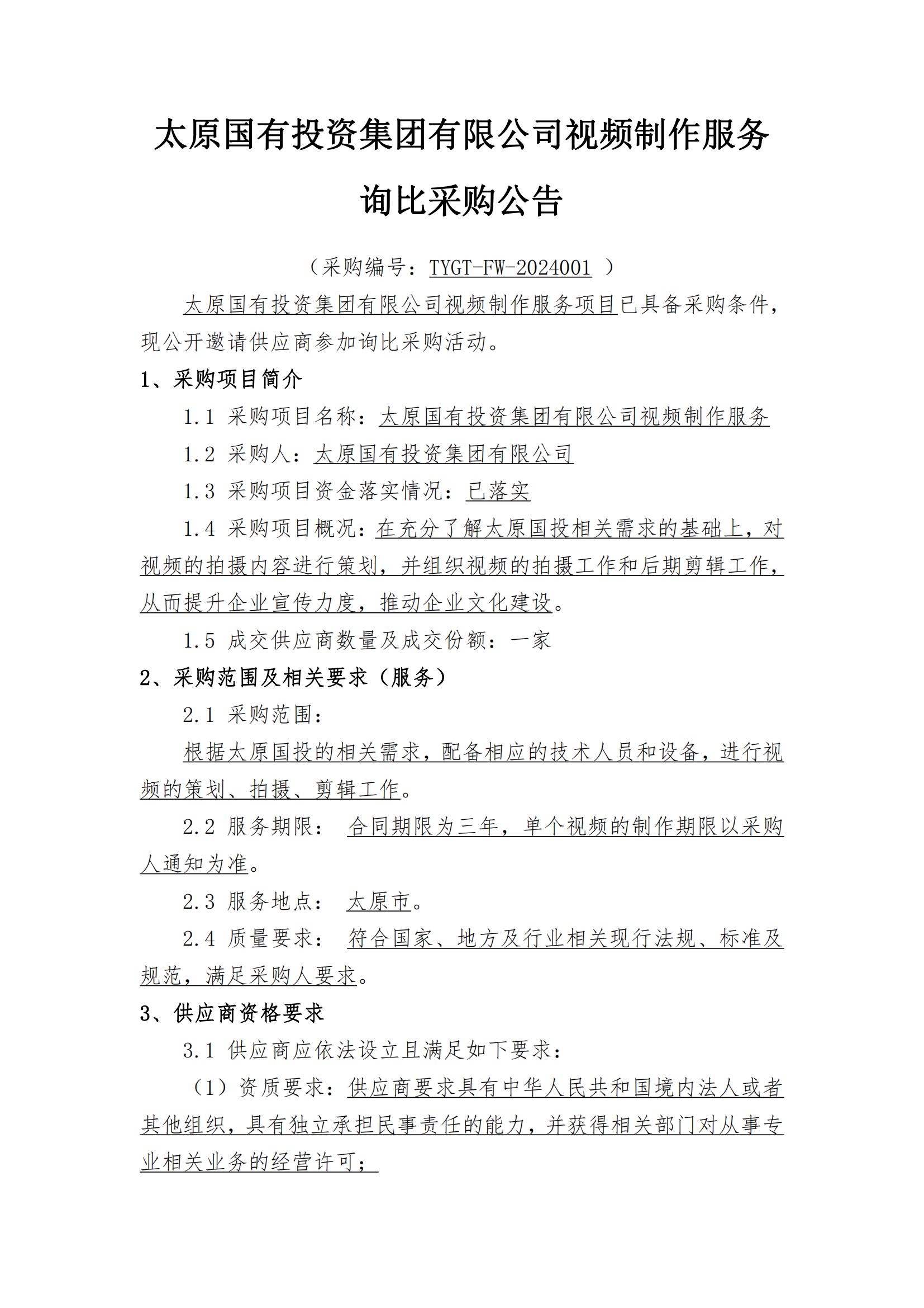 太原國(guó)有投資集團(tuán)有限公司視頻制作服務(wù)詢比采購(gòu)公告