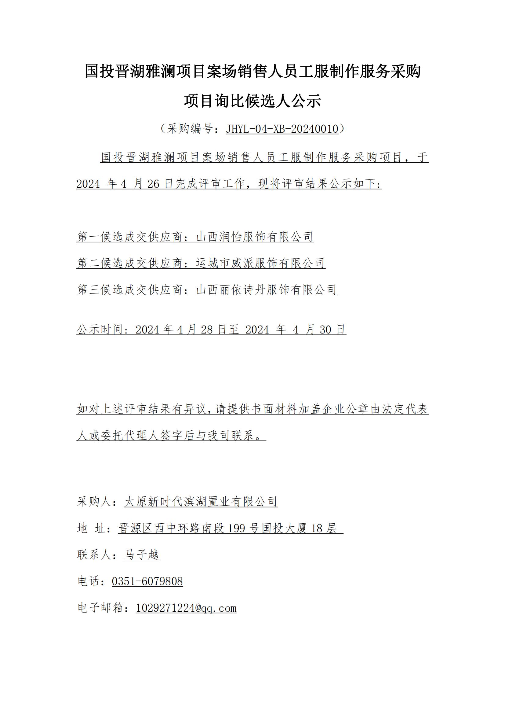 國投晉湖雅瀾項(xiàng)目案場銷售人員工服制作服務(wù)采購項(xiàng)目詢比候選人公示