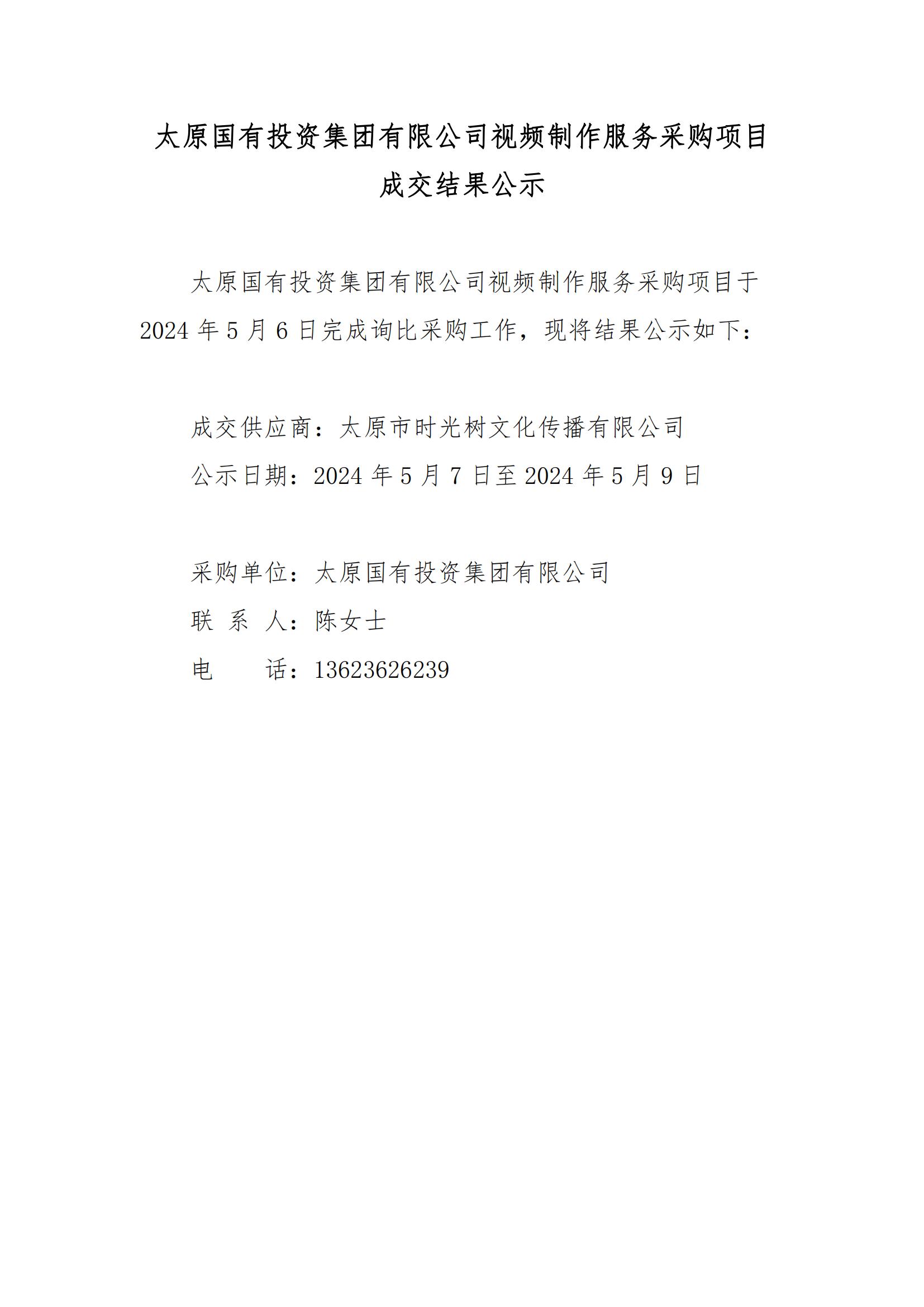太原國有投資集團有限公司視頻制作服務采購項目成交結果公示