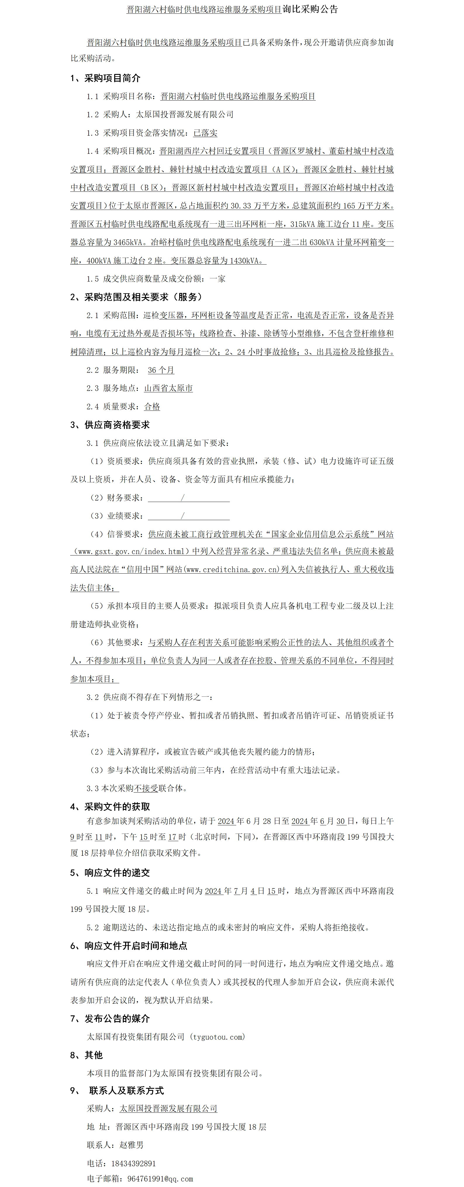 晉陽湖六村臨時供電線路運維服務(wù)采購項目詢比采購公告