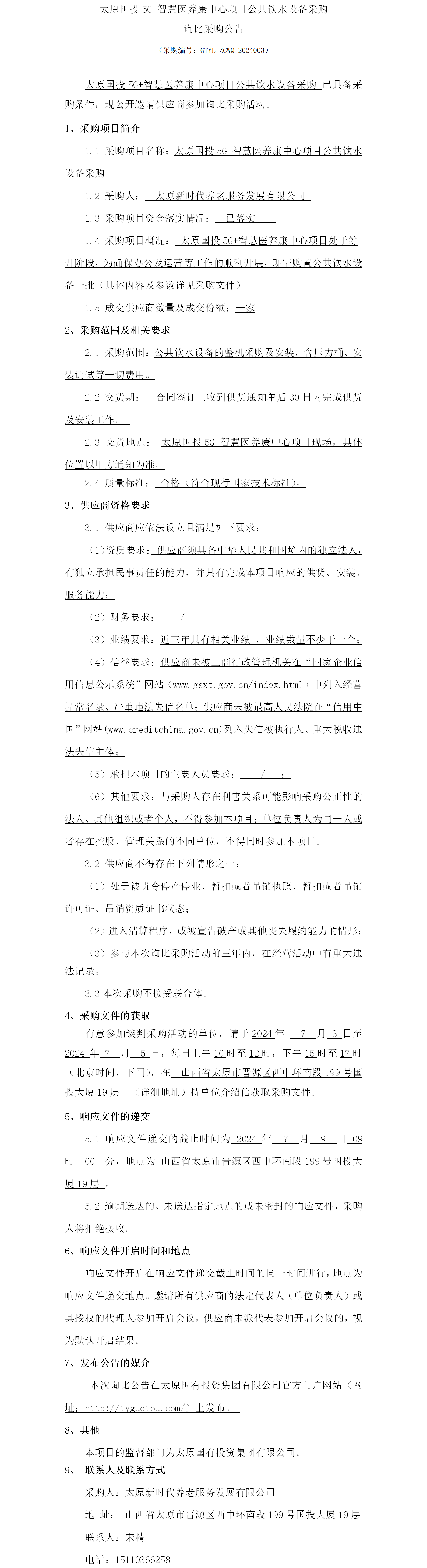 太原國投5G+智慧醫(yī)養(yǎng)康中心項目公共飲水設(shè)備采購詢比采購公告