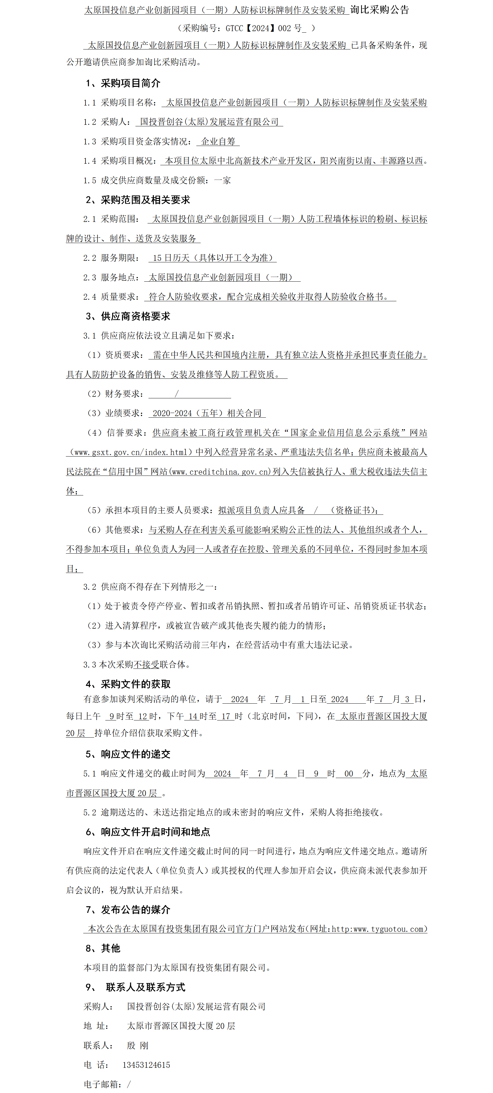 太原國投信息產業(yè)創(chuàng)新園項目(一期)人防標識標牌制作及安裝采購 詢比采購公告