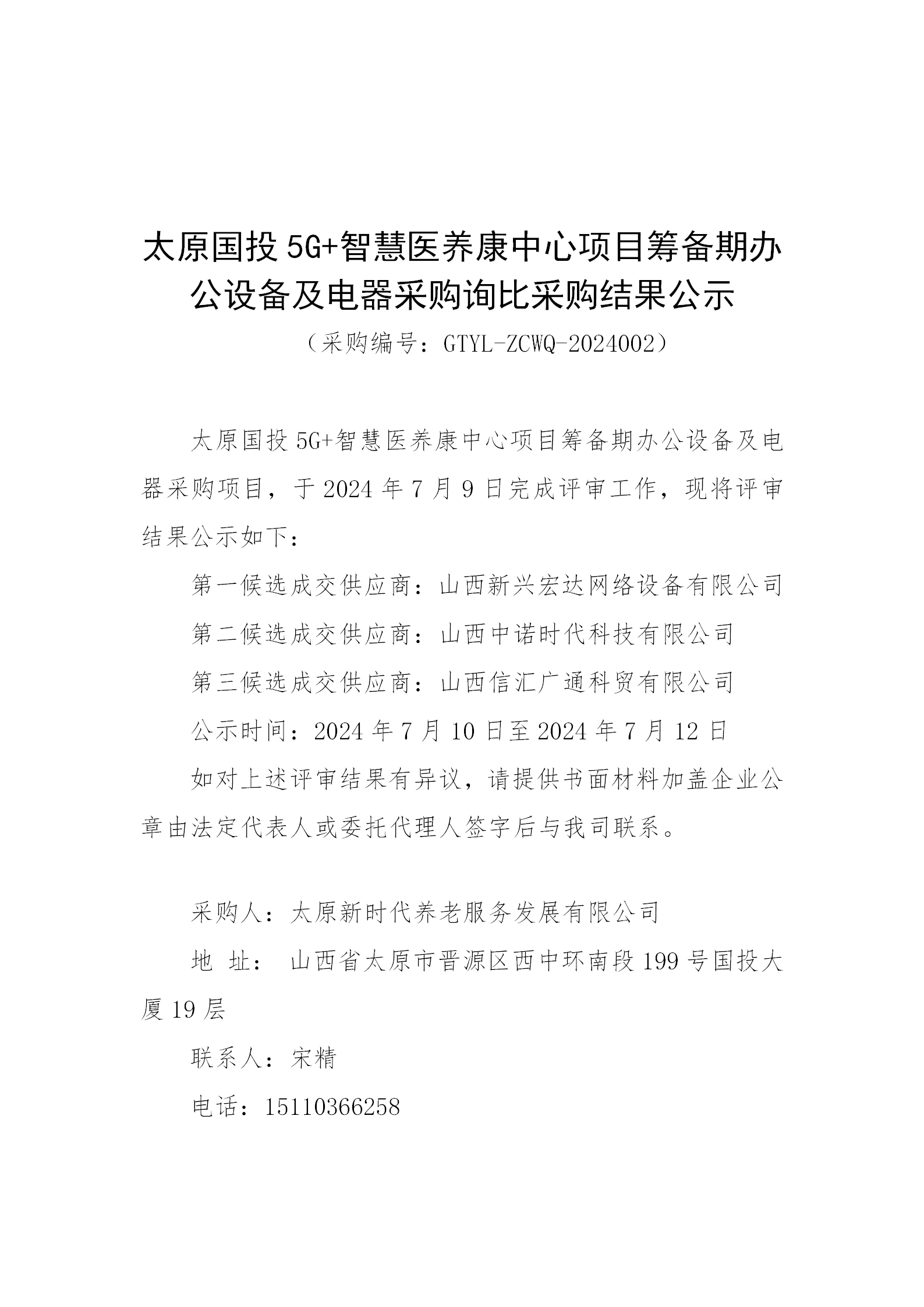 太原國(guó)投5G+智慧醫(yī)養(yǎng)康中心項(xiàng)目籌備期辦公設(shè)備及電器采購(gòu)詢(xún)比采購(gòu)結(jié)果公示