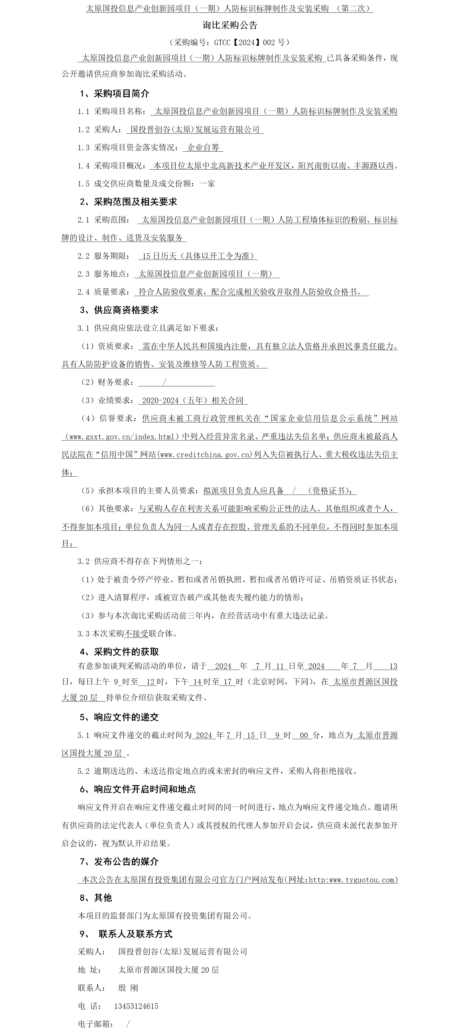 太原國投信息產(chǎn)業(yè)創(chuàng)新園項目(一期)人防標識標牌制作及安裝采購(第二次) 詢比采購公告