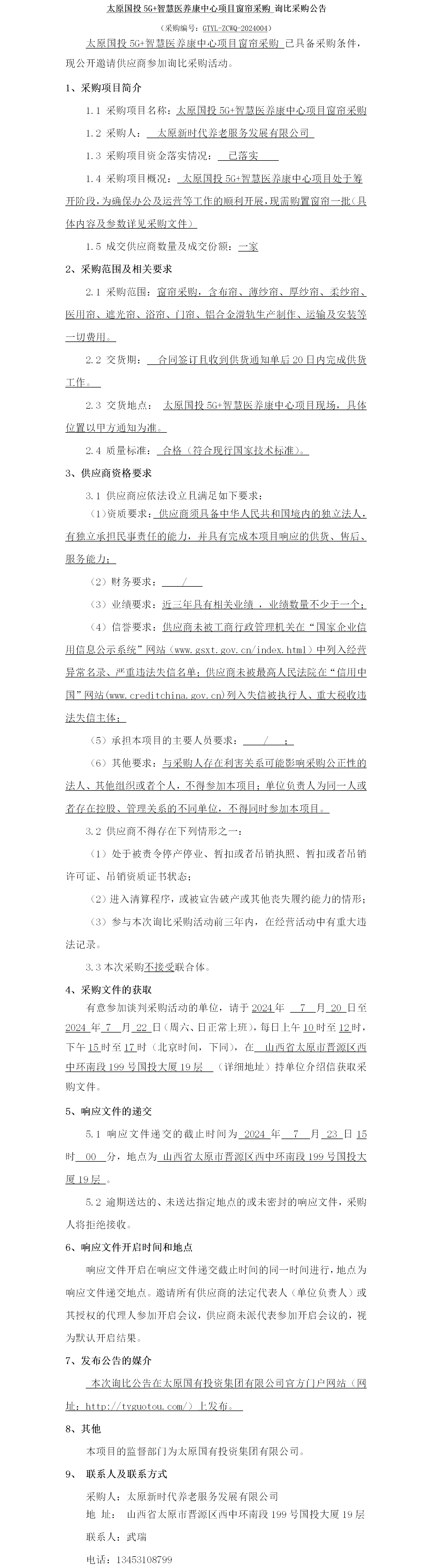 太原國(guó)投5G+智慧醫(yī)養(yǎng)康中心項(xiàng)目窗簾采購(gòu)詢比采購(gòu)公告