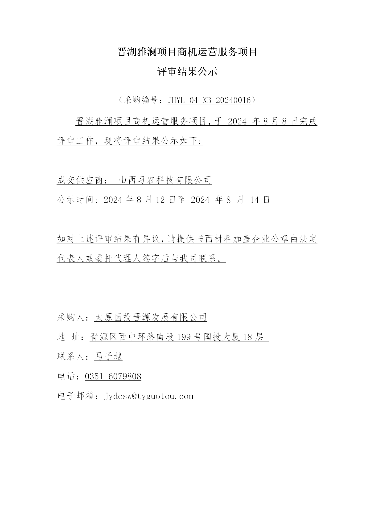 晉湖雅瀾項目商機運營服務項目評審結(jié)果公示