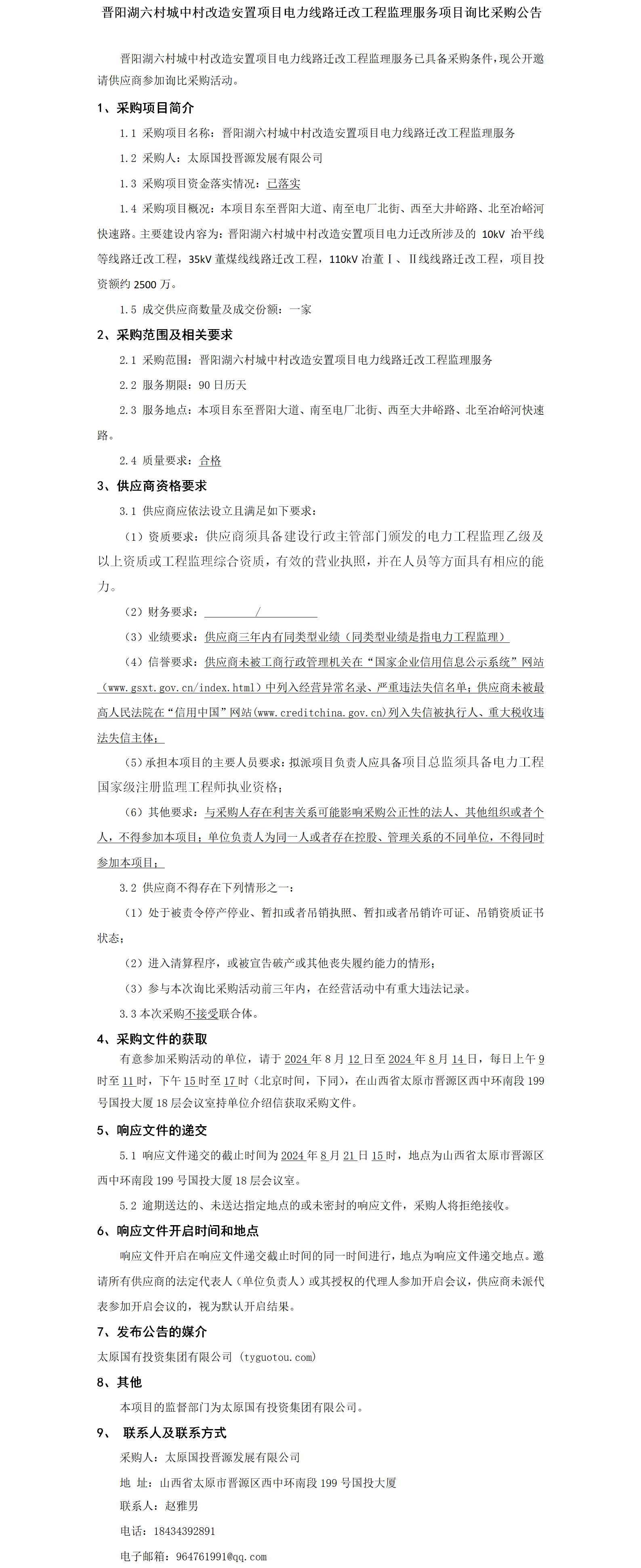 晉陽湖六村城中村改造安置項(xiàng)目電力線路遷改工程監(jiān)理服務(wù)項(xiàng)目詢比采購公告