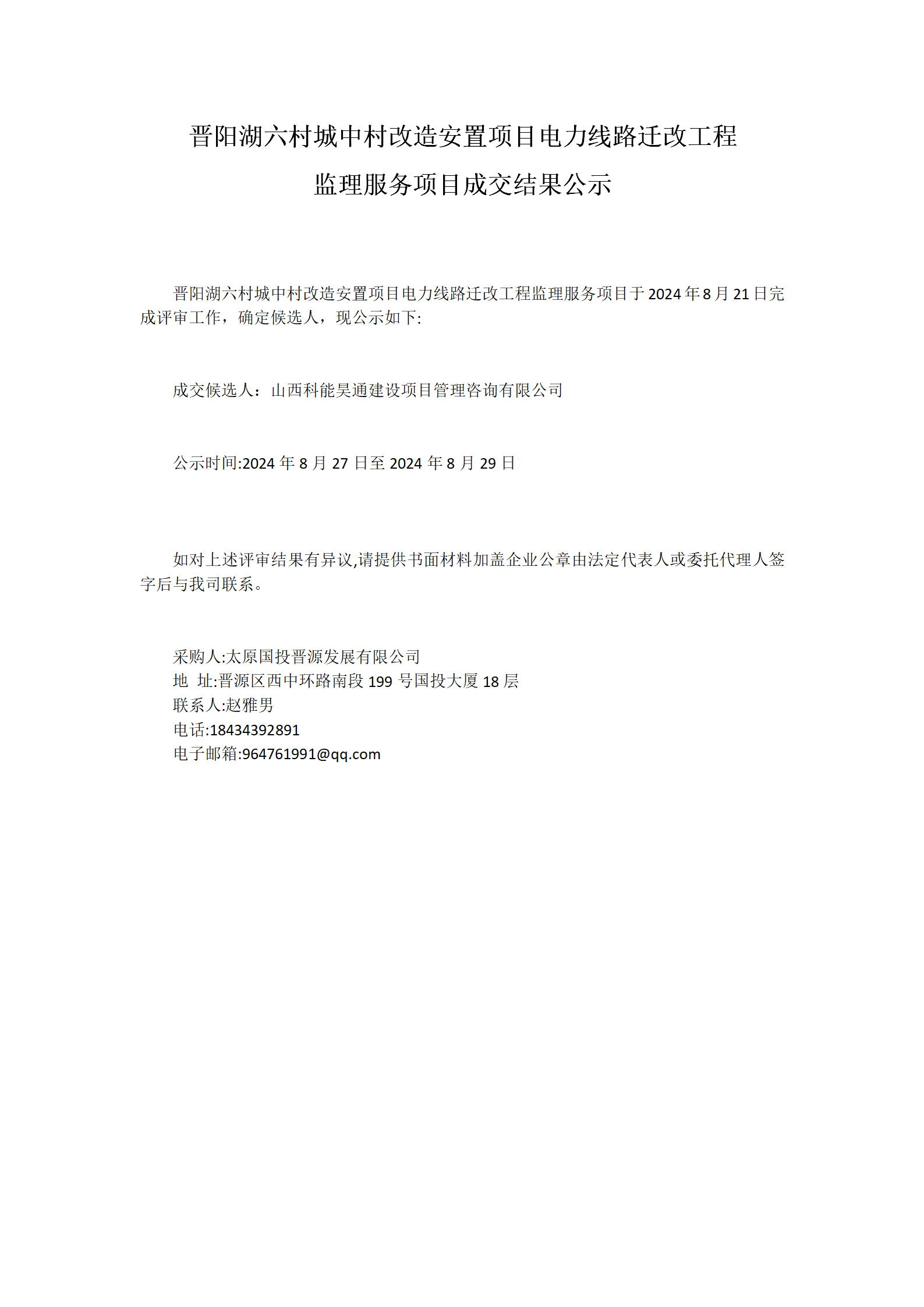 晉陽湖六村城中村改造安置項目電力線路遷改工程監(jiān)理服務項目成交結果公示