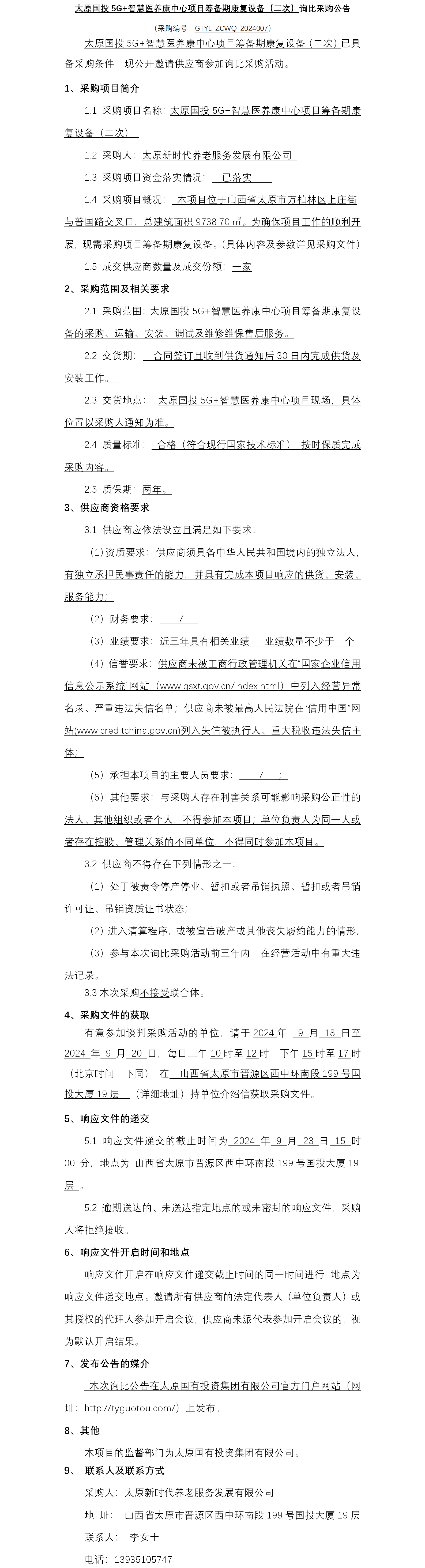 太原國(guó)投5G+智慧醫(yī)養(yǎng)康中心項(xiàng)目籌備期康復(fù)設(shè)備(二次)詢比采購(gòu)公告