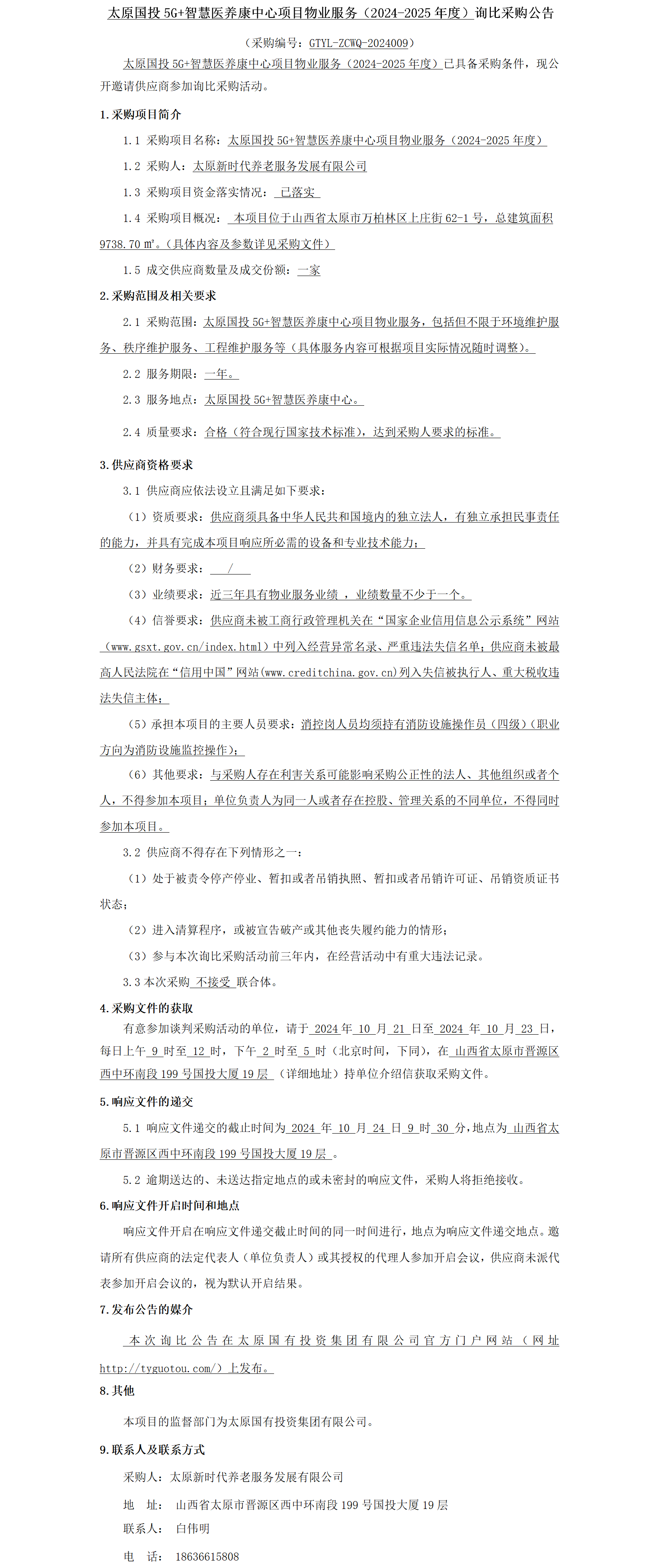 太原國投5G+智慧醫(yī)養(yǎng)康中心項目物業(yè)服務(wù)(2024-2025年度)詢比采購公告