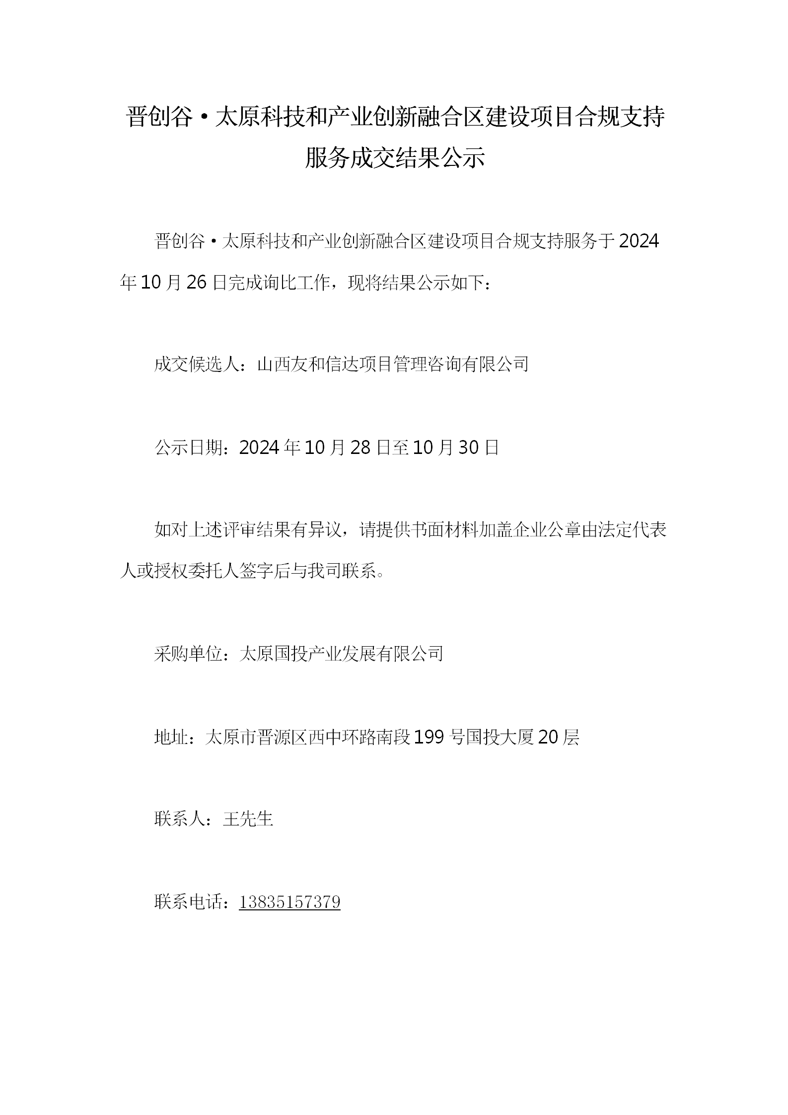 晉創(chuàng)谷·太原科技和產(chǎn)業(yè)創(chuàng)新融合區(qū)建設(shè)項(xiàng)目合規(guī)支持服務(wù)詢比采購(gòu)結(jié)果公示