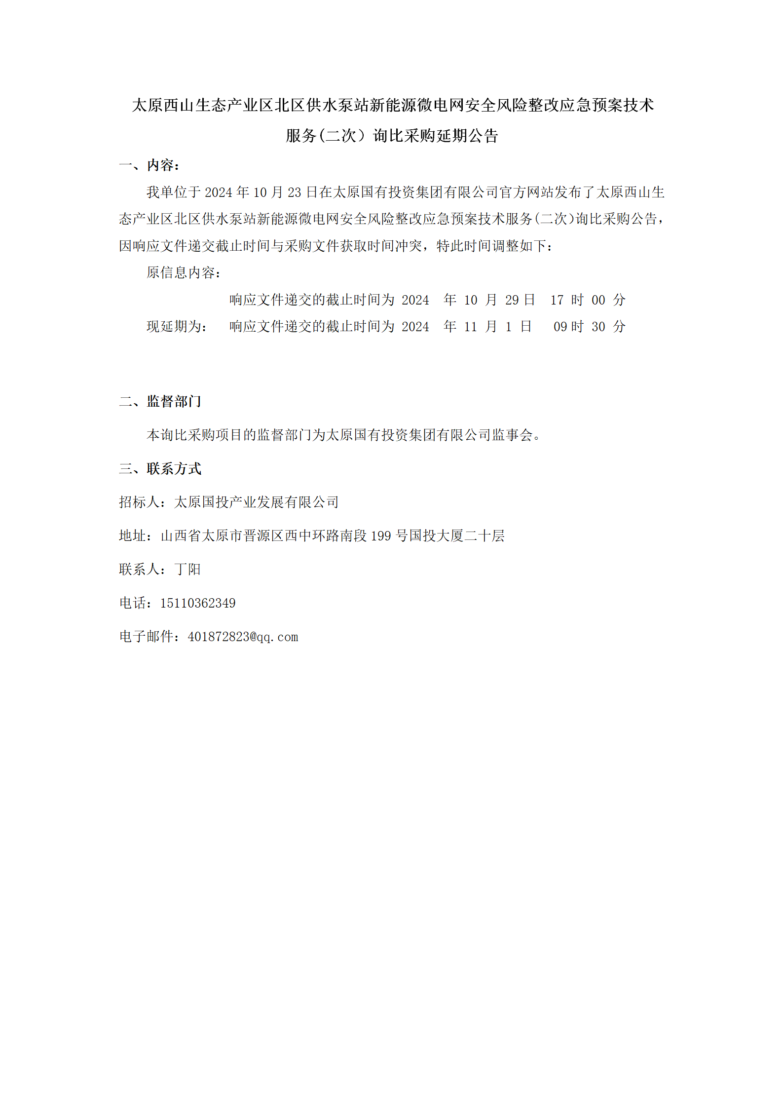 太原西山生態(tài)產(chǎn)業(yè)區(qū)北區(qū)供水泵站新能源微電網(wǎng)安全風(fēng)險(xiǎn)整改應(yīng)急預(yù)案技術(shù)服務(wù)(二次)詢(xún)比采購(gòu)延期公告