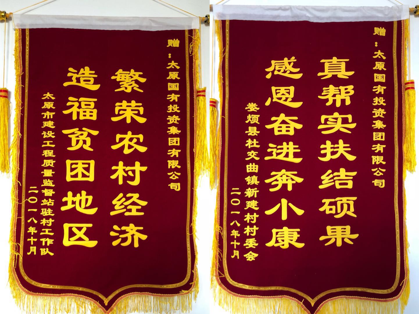 隨后,新建村村委會以及太原市建設(shè)工程質(zhì)量監(jiān)督站分別向我公司贈送了“繁榮農(nóng)村經(jīng)濟(jì)造福貧困地區(qū)”及“真幫實扶結(jié)碩果感恩奮進(jìn)奔小康”的錦旗。