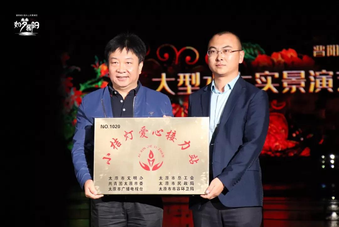 演出開(kāi)始前,太原廣播電視臺(tái)音樂(lè)廣播總監(jiān)王玉軍為晉陽(yáng)湖劇場(chǎng)頒發(fā)了小桔燈愛(ài)心接力站牌匾,晉陽(yáng)湖劇場(chǎng)也成為了太原市第1020家小桔燈愛(ài)心接力站點(diǎn)。